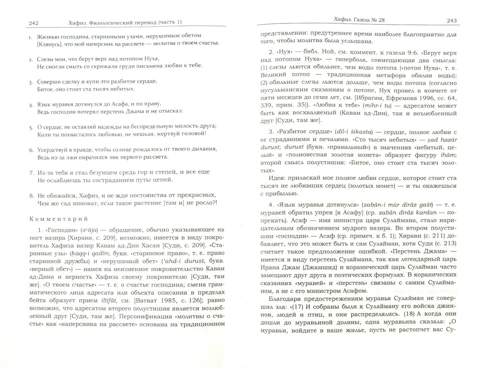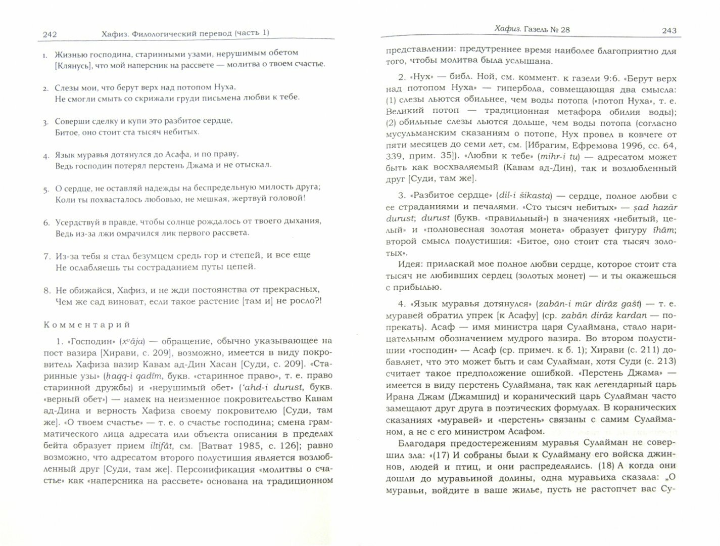 Шамсуддин Мухаммад Хафиз (ум. 1389) принадлежит к числу величайших лирических поэтов в мировой литературе. Хафиз хорошо знаком русскому читателю по многочисленным поэтическим переводам. Вниманию читателей предлагается первый филологический перевод газелей Хафиза на русский язык. Книгу открывает статья, в которой поэтика газели Хафиза рассматривается в контексте общего развития жанра. Переводу каждой газели предпослан текст оригинала; развернутые комментарии к переводам включают необходимую для понимания информацию: культурные и бытовые реалии, интертексты, лексико-грамматический анализ сложных пассажей. К изданию прилагаются указатель имен собственных и указатель коранических цитат и аллюзий. Настоящая публикация, в которой представлены газели 1-100, является первой частью полного филологического перевода "Дивана" Хафиза, планируемого к изданию в трех выпусках.