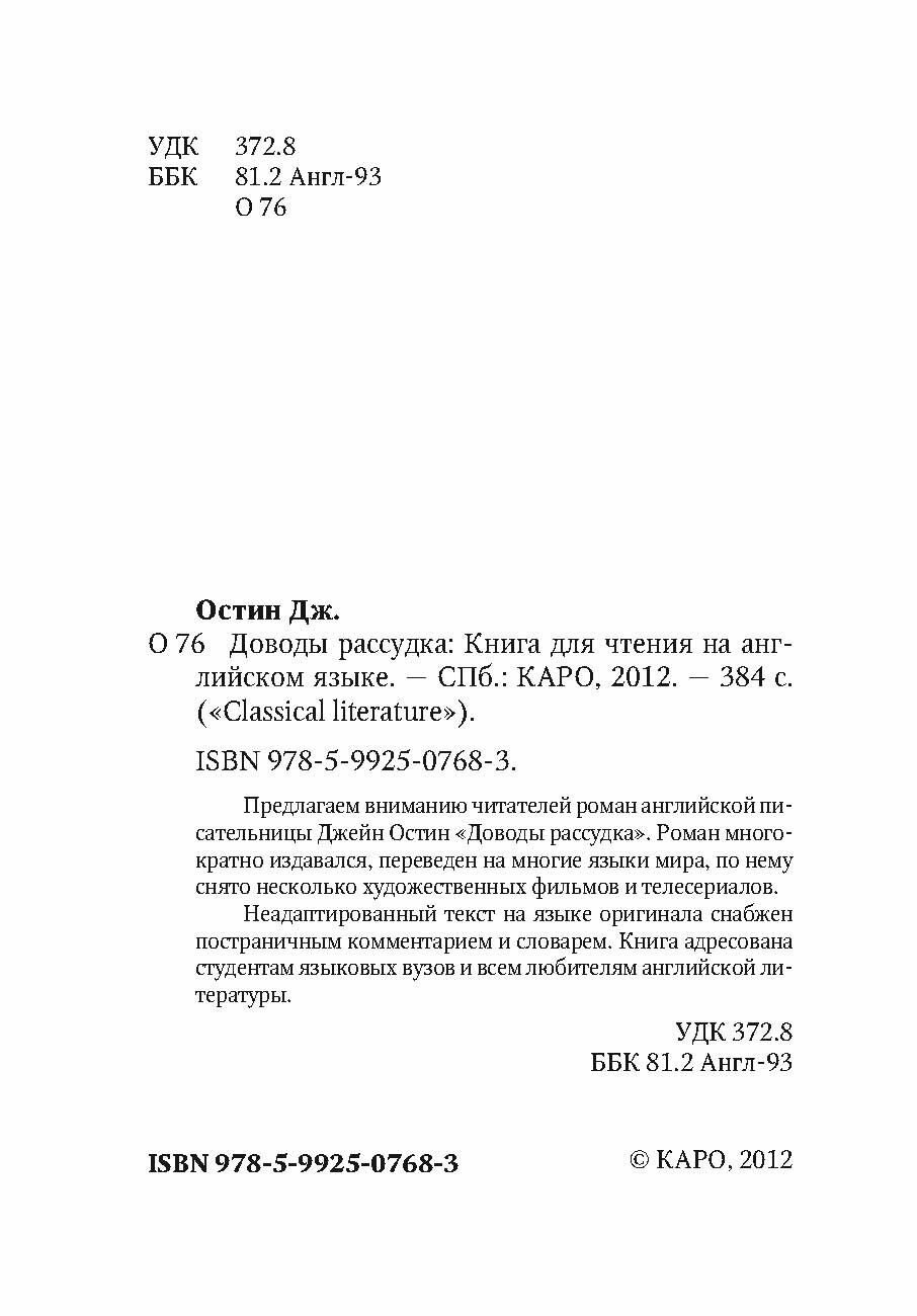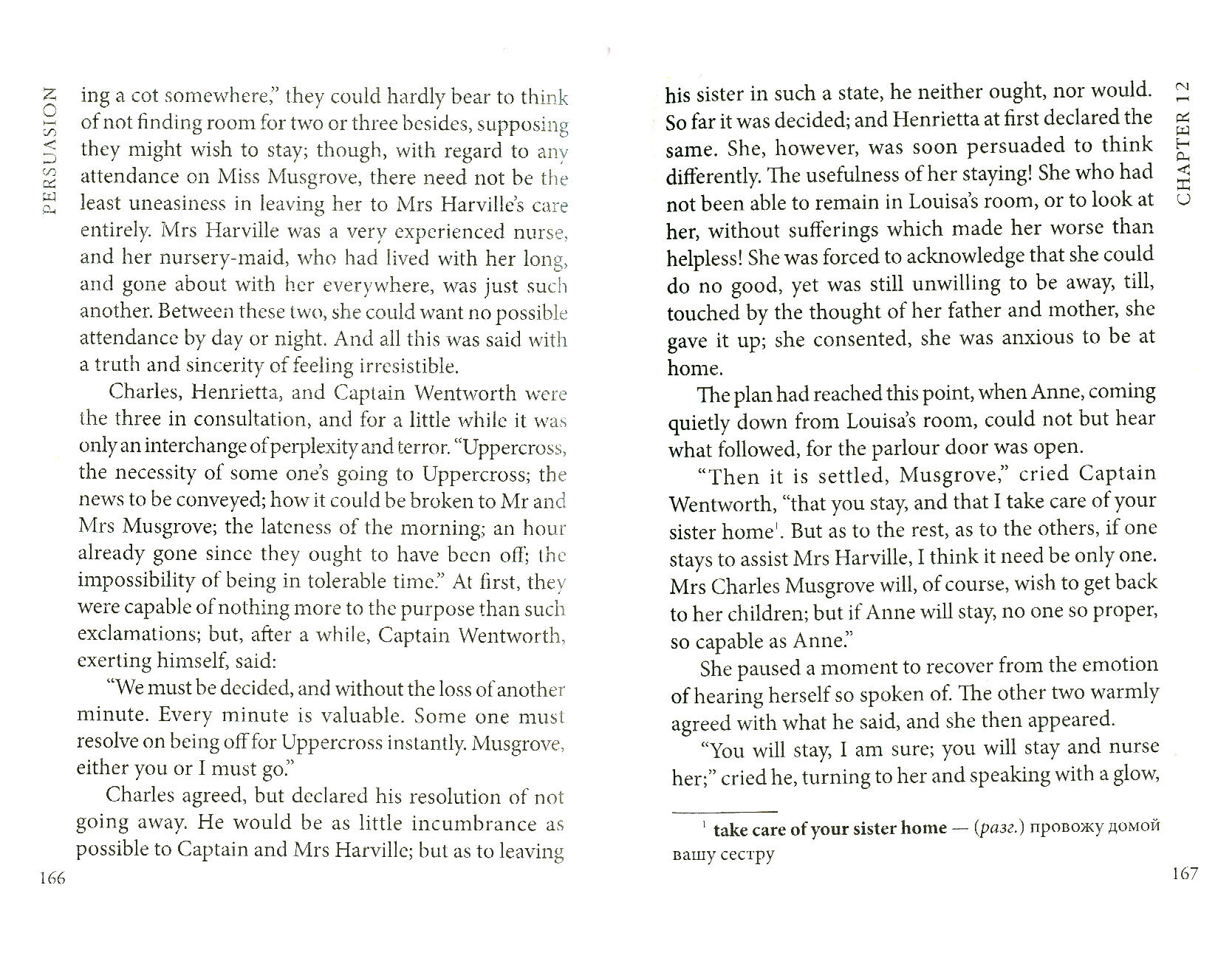 Каждый раз, читая романы Джейн Остен, я просто отдыхаю!Я радуюсь и расслабляюсь, когда чувствую эту лёгкость слова, наслаждаюсь тонким английским юмором и иронией. Когда наступает депрессия или хандра, читайте ее книги и вам безусловно станет легче!"Доводы рассудка"может быть немного уступают романам"Гордость и предубеждение" и"Эмма", но лишь совсем чуть-чуть. Эта книга нас учит доверять не только голосу разума, но и своим чувствам. Она о любви, которая не знает преград, не проходит сквозь время. Насчёт данного издания, текст неадаптированный (оригинал), есть постраничные комментарии и переводы сложных слов. Думаю, со средним уровнем английского его можно прочитать. Бумага офсетная, плотная. Обложка мягкая, очень симпатичная.