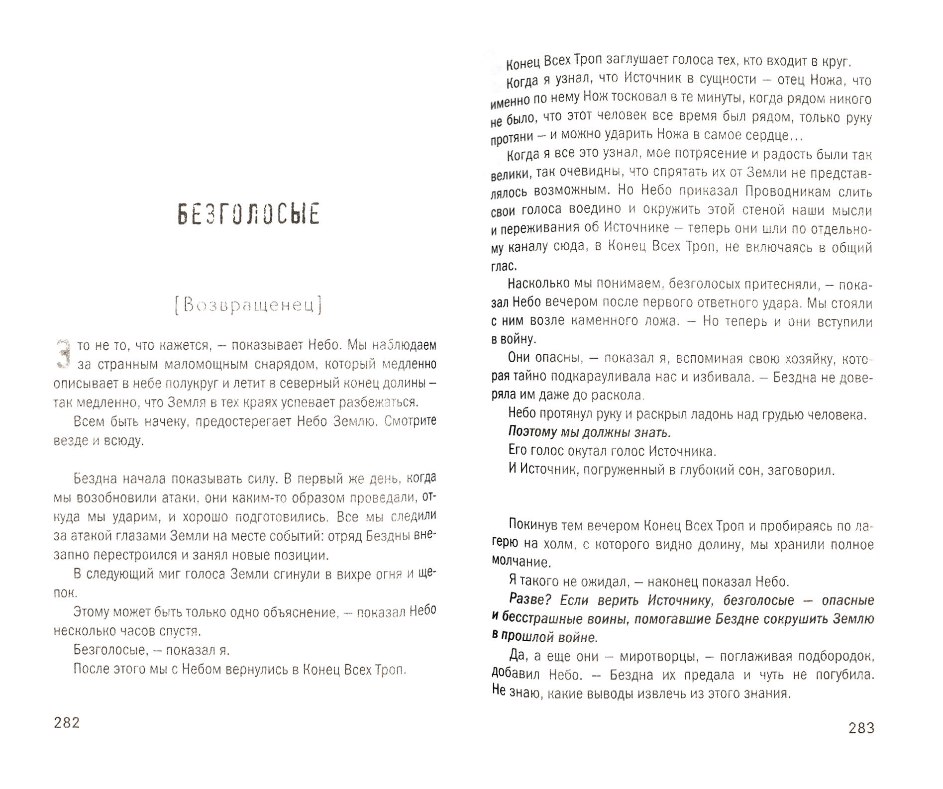 Книга супер! Я читала всю трилогию взахлеб, не могла оторваться) Давно меня так не захватывала книга. Сюжет не дает заскучать ни минуты, все время держит в напряжении. А финал вообще супер - такой пронзительный и немного неожиданный. Вообще вся трилогия о любви, о дружбе, если ты кого-то любишь по-настоящему, то тебе не страшны никакие преграды. "Он говорил, что никого нельзя любить всей душой, иначе тобой с помощью этого человека будут помыкать. Нет, на самом деле все иначе: надо любить кого-то всей душой, и тогда никто и никогда не сможет тобой помыкать." (Тодд Хьюитт)