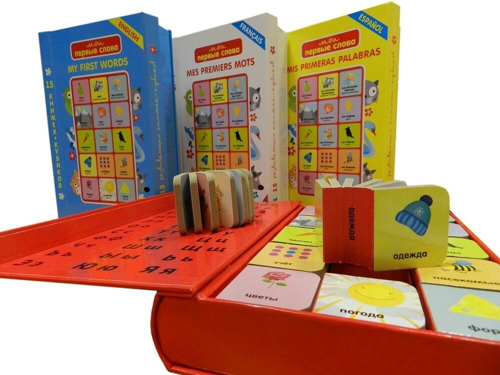 Даже самые крошечные малыши интересуются книжками. И хорошо, когда книжки для них делают такие же крошечные. Как раз для маленьких пальчиков в этой коробке лежит 15 книжек-кубиков. У них плотные картонные странички, которые позволяют ребенку развивать мелкую моторику. На них нарисованы животные, предметы, цвета – все, что знакомо малышам. И над каждым рисунком – слово крупными буквами.