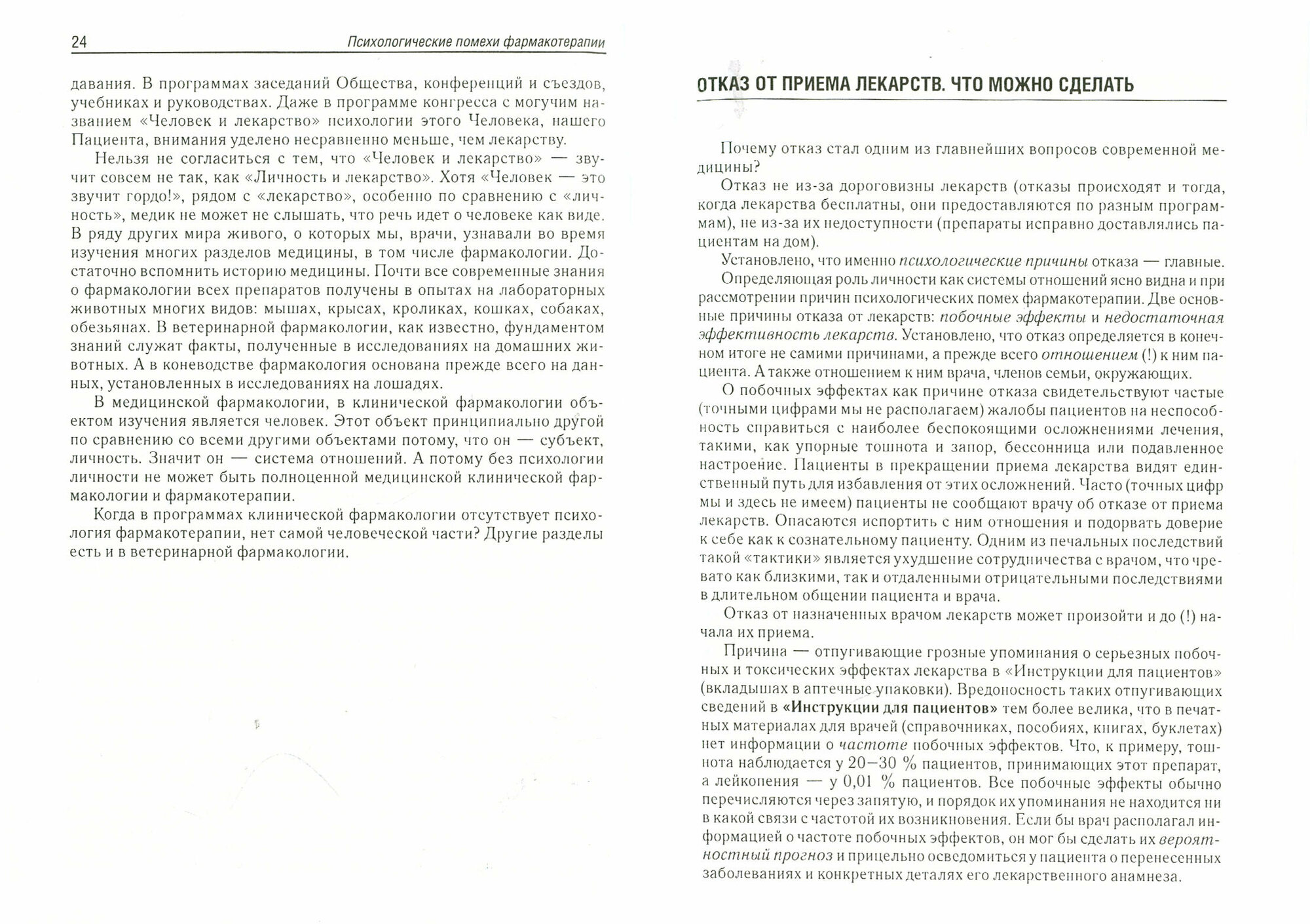 В книге дан анализ основных факторов психологии фармакотерапии, препятствующих успешному лечению. Представлена определяющая роль сотрудничества (комплайенса) пациента и врача и совладания (копинга) как решающих факторов успеха. Особое внимание уделено двум главным причинам отказа от лечения: отношению пациента к побочным эффектам, пережитым или ожидаемым (из-за отпугивающей информации в "Инструкции для пациентов"), и отношению к ожидаемому лечебному эффекту. Подчеркнута роль семьи в обеспечении комплайенса. Выделено участие положительного и отрицательного плацебо-эффектов. Отмечена важность суеверий, измышлений и заблуждений в облике личности пациента и его отношения к лечению лекарствами.