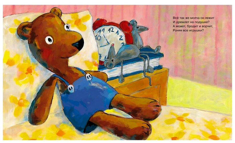 Что делают игрушки, когда их никто не видит? Одна маленькая, но очень изобретательная девочка решила во что бы то ни стало это узнать. Она принялась следить за своим любимым мишкой, как заправская шпионка: пряталась, притворялась спящей, подглядывала в окно, - но так просто его не проведёшь! Тогда хитрая девочка придумала приманку, перед которой не устоит ни один настоящий мишка…Благодаря запоминающимся рифмам Бруно Хэхлера в переводе Натальи Хрущевой и уютным иллюстрациям Бирте Мюллер эта книга наверняка станет любимой у вашего малыша.