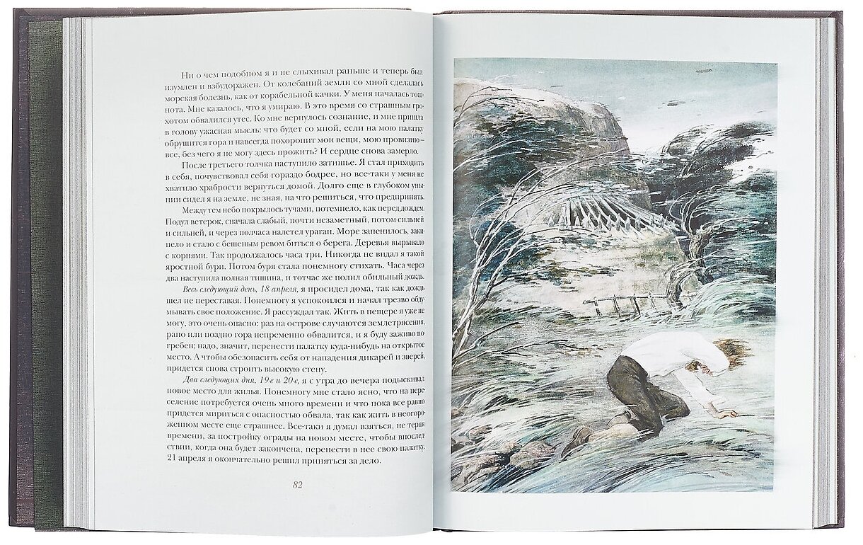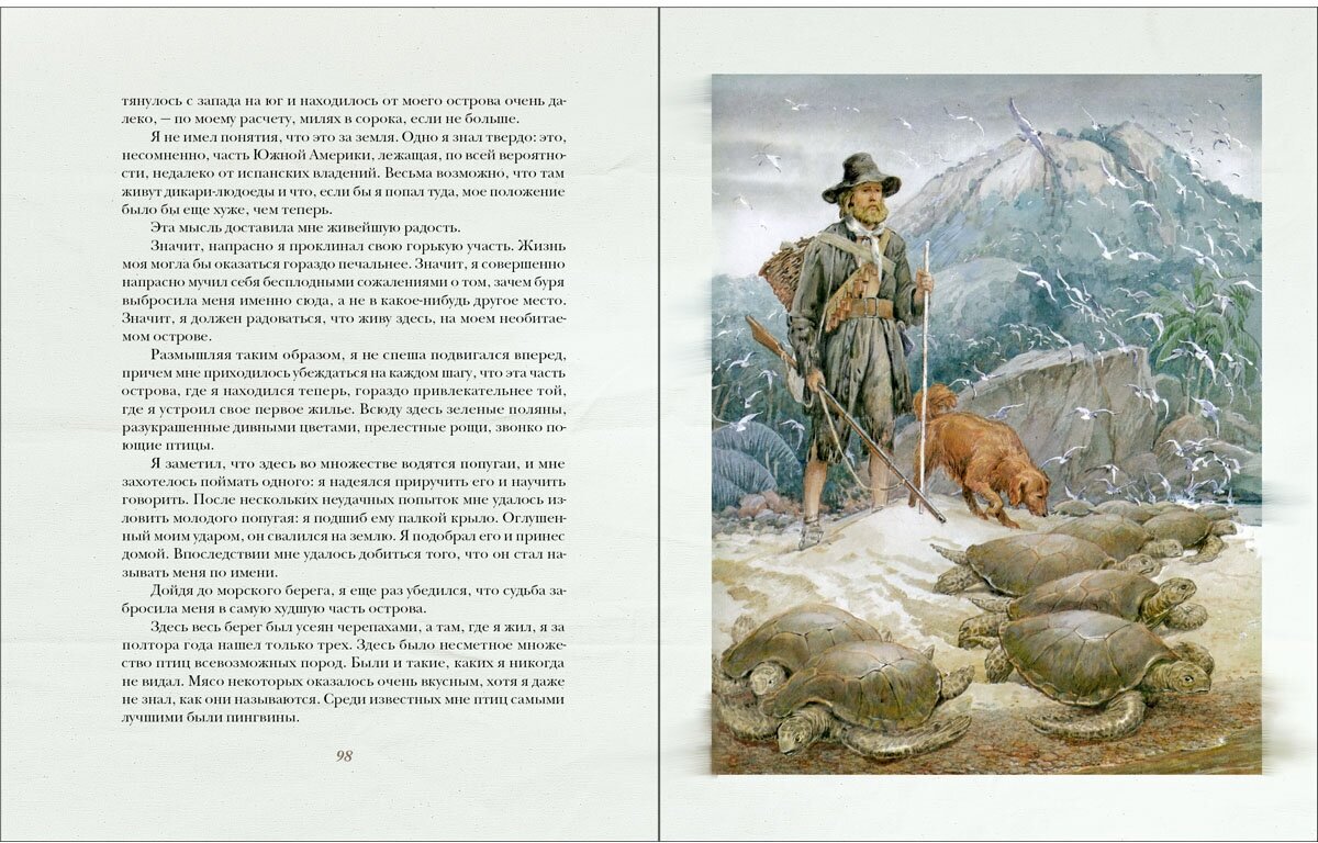Хватит ли человеку мужества после кораблекрушения вновь отправиться в морское путешествие? А сможет ли он прожить на необитаемом острове двадцать восемь лет два месяца и девятнадцать дней? Приключенческая литература всегда привлекала художника Игоря Ильинского. Он иллюстрировал Майн Рида и Анатолия Рыбакова, Фенимора Купера и братьев Стругацких. А уж история Робинзона Крузо вряд ли могла оставить равнодушным художника - знатока исторических эпох, эрудита, мастера достоверных деталей. И герой Дефо шьет себе костюм из козьих шкур, мастерит зонтик, вскапывает огород без лопаты, строит лодку с помощью одного топора- и дикий остров его трудами превращается в цветущий сад.