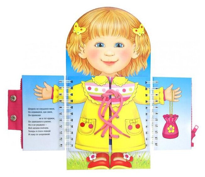 Книжка-тренажер поможет ребенку развить мелкую моторику, речевые навыки и самостоятельность.Ваш малыш научится: — завязывать шнурки и ленточки; — застегивать молнии, пуговицы, липучки и пряжки.Книжка с вырубкой.