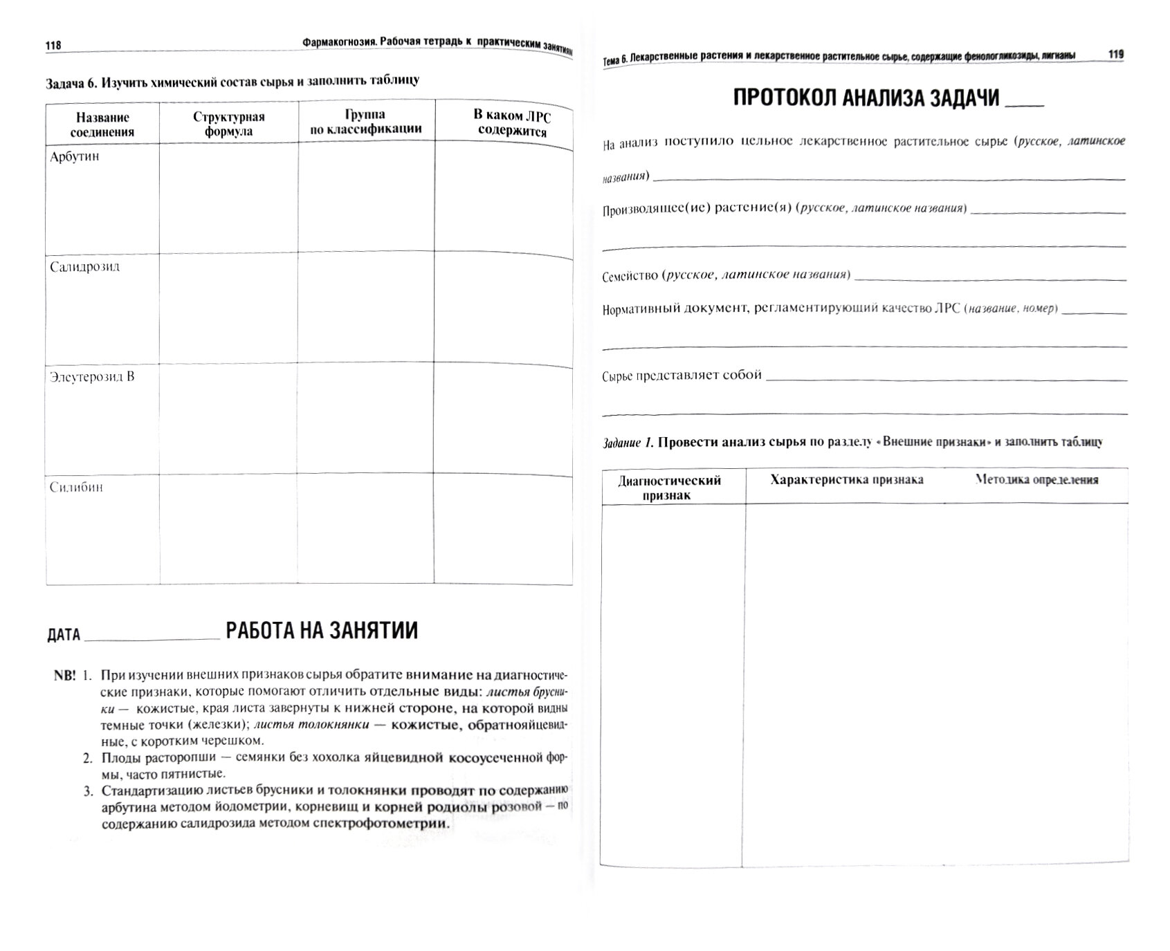 Учебное пособие является составной частью учебно-методического комплекса по фармакогнозии. Оно составлено в соответствии с программой и Федеральным государственным образовательным стандартом, согласно которому специалист для реализации профессиональных компетенций должен обладать умением решать задачи в области фармакогнозии. В пособии описаны практические работы, задания для подготовки к занятиям. В каждой теме содержатся учебные таблицы, особые указания и подробный план выполнения практических работ. Работа на занятии включает полный анализ лекарственного растительного сырья, изучение микродиагностических признаков объектов темы и хроматографических характеристик (если это предусмотрено нормативной документацией). Предназначено студентам фармацевтических факультетов и фармацевтических вузов для подготовки к занятиям и выполнения практической работы на занятиях по фармакогнозии.