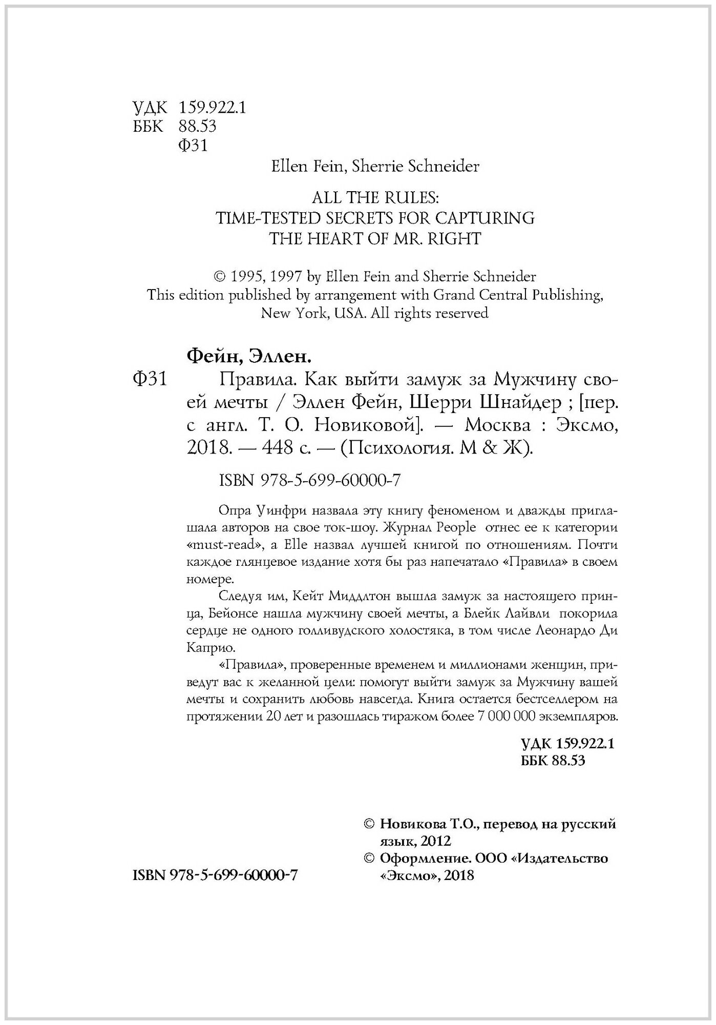 "Правила", проверенные временем и миллионами женщин, приведут вас к желанной цели: помогут выйти замуж за Мужчину вашей мечты и сохранить любовь навсегда. Книга остается бестселлером на протяжении 20 лет и разошлась тиражом более 7 000 000 экземпляров.