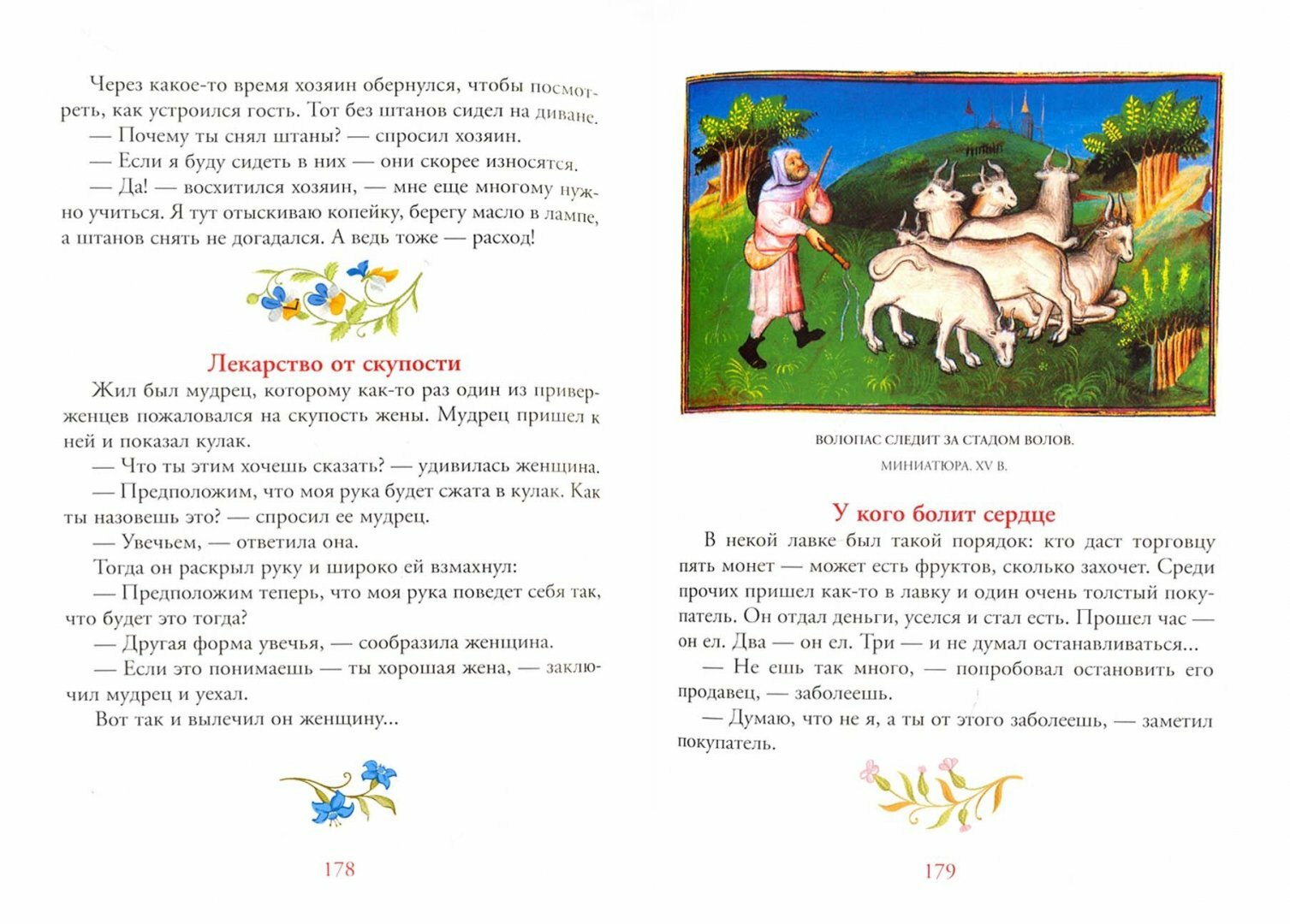Интересное вступительное слово д.э.н. Ю.В.Якутина, Притчи разнообразные - сгруппированы по главам тематически (см.содержание), каждую из глав предваряет эпиграф из евангельских притч, заголовки-изречения из книги Притч Соломона, интересное, не назойливое оформление: цветочки - василечки между притчами, использовано много цветных миниатюр средних веков. Переплет хороший, подозрений на то, что может развалиться по листочкам при длительном и частом использовании (а содержание это подразумевает) пока не возникает. Единственная "хотелка" - был бы он помягче, потактильнее, что ли - из рук бы не выпускала )), а так - уж очень углы острые.