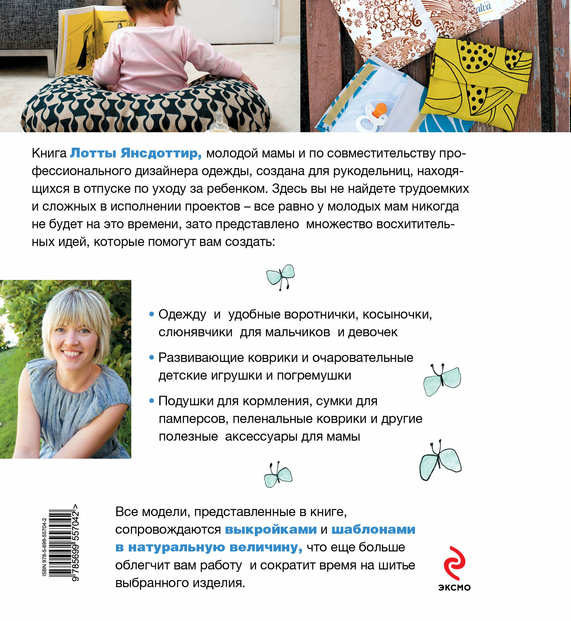 Книга Лотты Янсдоттир, молодой мамы и по совместительству профессионального дизайнера одежды, создана для рукодельниц, находящихся в декретном отпуске. Все изделия, представленные здесь, можно сшить за час-полтора, однако, при кажущейся простоте, они удобные, красивые и многофункциональные. Благодаря этой книге, вы сможете ненадолго отвлечься от повседневных хлопот, связанных с уходом за малышом, и сшить множество великолепных изделий, таких как платьица и штанишки, воротнички и слюнявчики, развивающие коврики и мягкие игрушки, а также подушки для кормления, пеленальные коврики и сумки для памперсов. Все модели сопровождаются выкройками и шаблонами в натуральную величину, что еще больше облегчит вам работу и сократит время на шитье выбранного изделия.