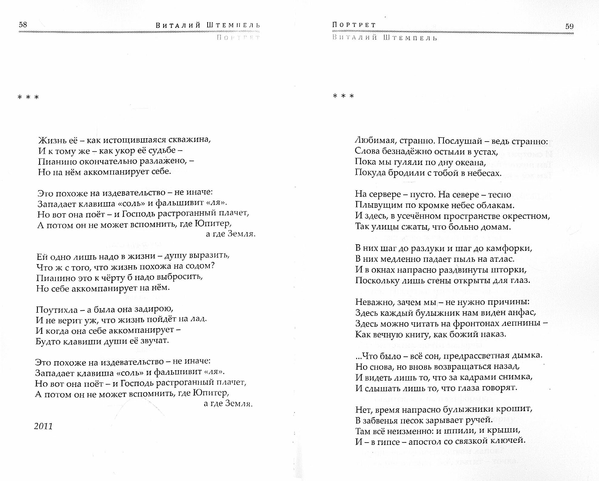 Виталий Штемпель - автор поэтических сборников "Песочные часы" (2005), "На уровне дыхания" (2009) и книги переводов из немецкой поэзии "Говорит любовь" (2011). Живет в Германии.