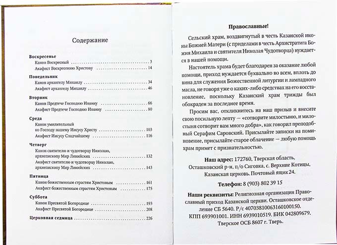 Настоящее издание предлагает православному читателю сборник канонов и акафистов на каждый день недели, составленный согласно данной церковной традиции. Воскресенье — начало церковной недели, посвящено основе христианства — Воскресению Христову. В понедельник Церковь прославляет святых ангелов. Во вторник — пророков, а между ними преимущественно Предтечу и Крестителя Господня Иоанна как более славного из них. В среду Господь Иисус Христос был предан на страдания и смерть и Церковь с апостольских времен посвятила этот день благоговейному воспоминанию этого события. Четвертый день седмицы посвящается Церковью святым апостолам и святителю Николаю Чудотворцу. В пятницу воспоминается крестная смерть Спасителя. В субботу Церковь ублажает всех святых и Пресвятую Богородицу.