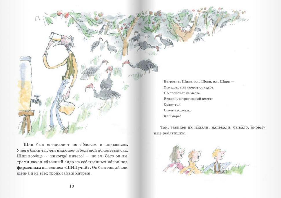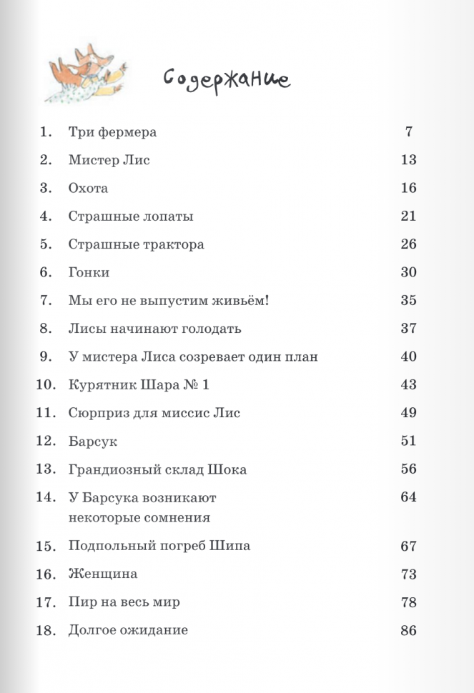 Три фермера: обжора и злюка, просто нехороший человек и как-бы помягче для детей - любитель сидра решили прикончить лиса, который промышлял на их землях. Разыскав лисью нору, они попытались добраться до логова, но лис предпринял отступающий маневр, который привел к крупномасштабным военным действиям с применением тяжелой техники и имел неожиданные последствия, как говорится "не рой другому яму"... Развязка не тривиальная. Специально не пересказываю сюжет полностью, потому как пропадет вся интрига и удовольствие от финала. Мне понравилось, пятилетней дочери пока не решила читать или нет.