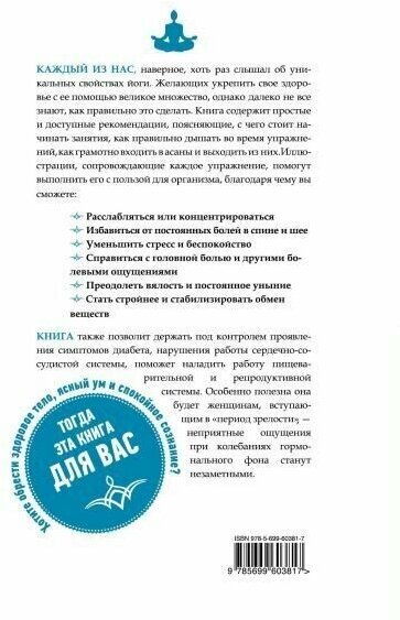 Книга иностранного автора . Несложные упражнения для расслабления и оздоровления организма , с указанием полезности каждого упражнения . Не люблю йогу из-за ее сложности и труновыполнимости . Эта книга с простыми и полезными упражнениями . Не йога , а скорее лечебная гимнастика . Будет полезна всем . Рекомендую .