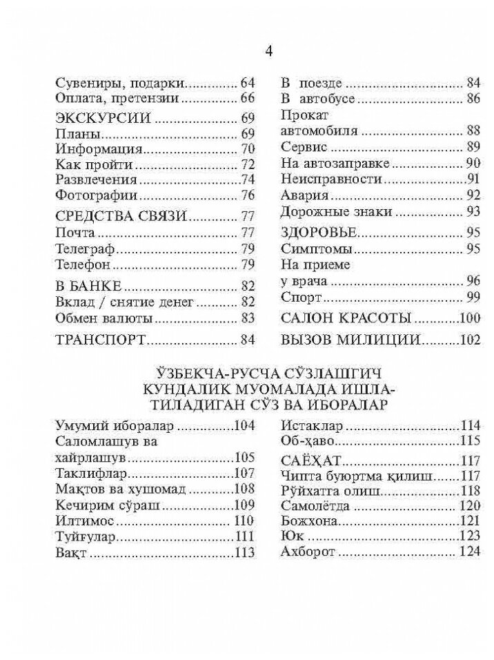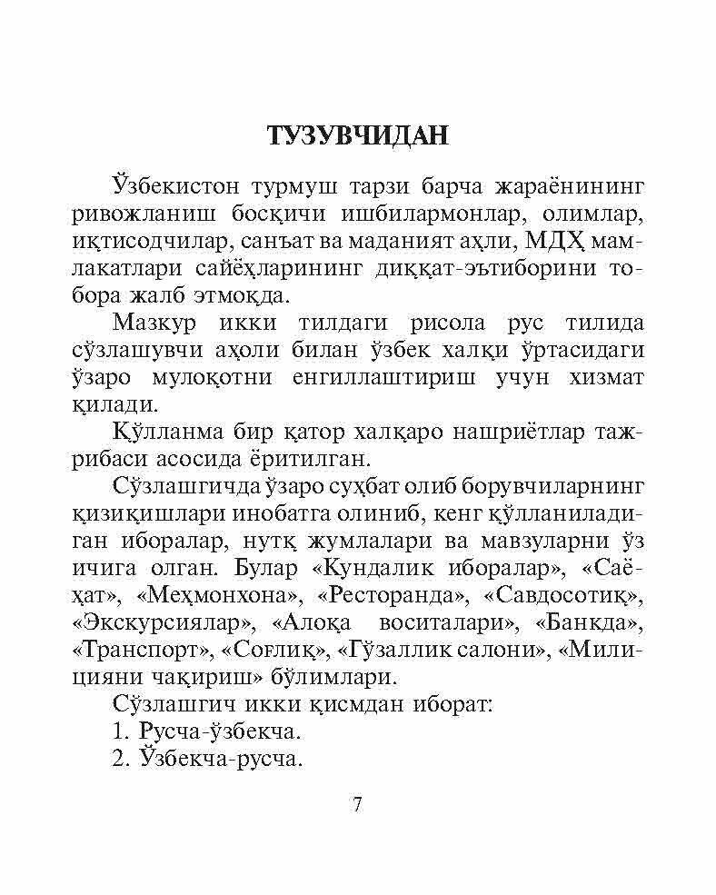 Разговорник содержит типичные модели фраз и выражений по широкому кругу тем. Узбекский текст снабжен практической транскрипцией, передающей звуки узбекского языка средствами русской графики. .Разговорник предназначен для российских граждан, с разными целями посещающих Узбекистан и не владеющих узбекским языком.
