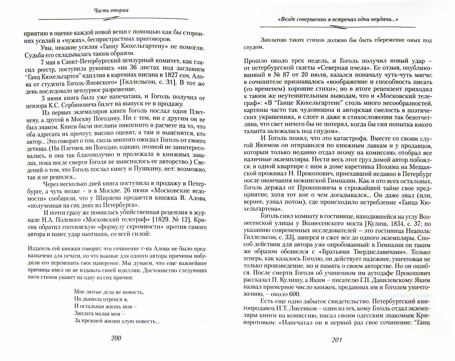 Книга поразила меня и объемом собранного материал, и тщательностью его обработки, проверки, скрупулезности, уточнения нюансов. Здесь воссоздана жизнь Гоголя до 26-летнего возраста, в котором вышли его первые книги: «Вечера…», «Миргород», «Арабески». Это очень хорошая книга для тех, кто достаточно хорошо представляет жизнь Гоголя по вузовским курсам. Но всем с тем она для массового читателя и лишена специальной терминологии. На мой взгляд, в книге недостаточно раскрыт сам процесс написания книг Гоголем, хотя много ссылок на скрытность Николая Васильевича в этом вопросе и много информации о том, как они были встречены тогдашней читающей публикой. Впервые я здесь встретил утверждение, что практически с «Вечеров…» Гоголь начал воспринимать свою жизнь как миссию учителя и исправителя народа российского. Рекомендую всем. Борис Б.
