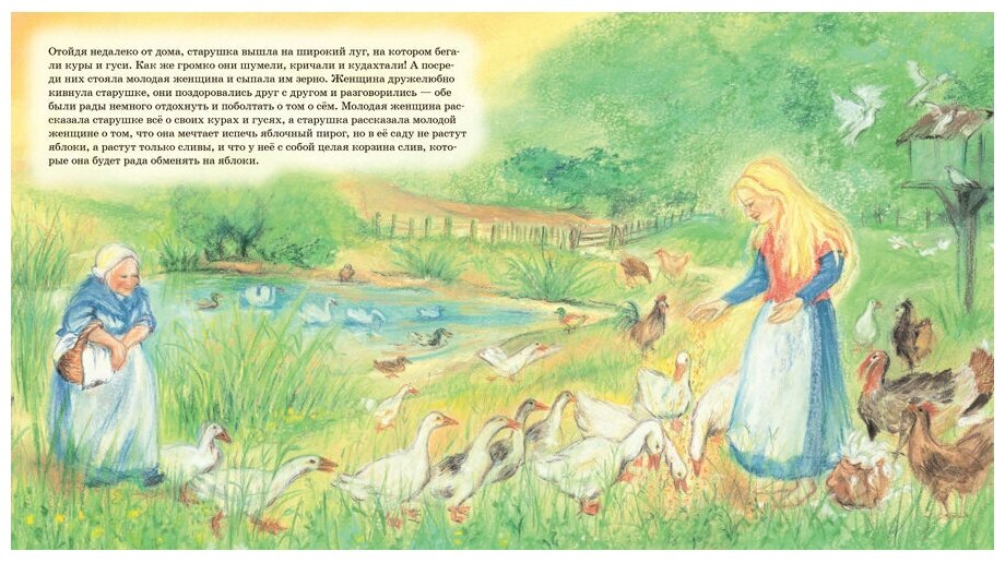 Хорошая, добрая книга, понятная ребенку 2-х лет. Ребенок, конечно, не воспринял книгу как книгу про «сложную систему хозяйственных связей, на которой строится благосостояние общества и которую мы, взрослые, обычно называем экономикой». Ребенок просто понял, что книга – про добрую старушку, которая захотела яблочный пирог, но, поскольку яблок у нее не было, она насобирала в своем саду слив и отправилась в путь в надежде обменять их на яблоки. Сливы она обменяла на пух для подушки, пух – на цветы. Цветы она отдала просто так, но ей за это дали золотой медальон, который она подарила бедной женщине, получив за это щенка. Щенка подарила одинокому старику, наконец получив за это яблоки.