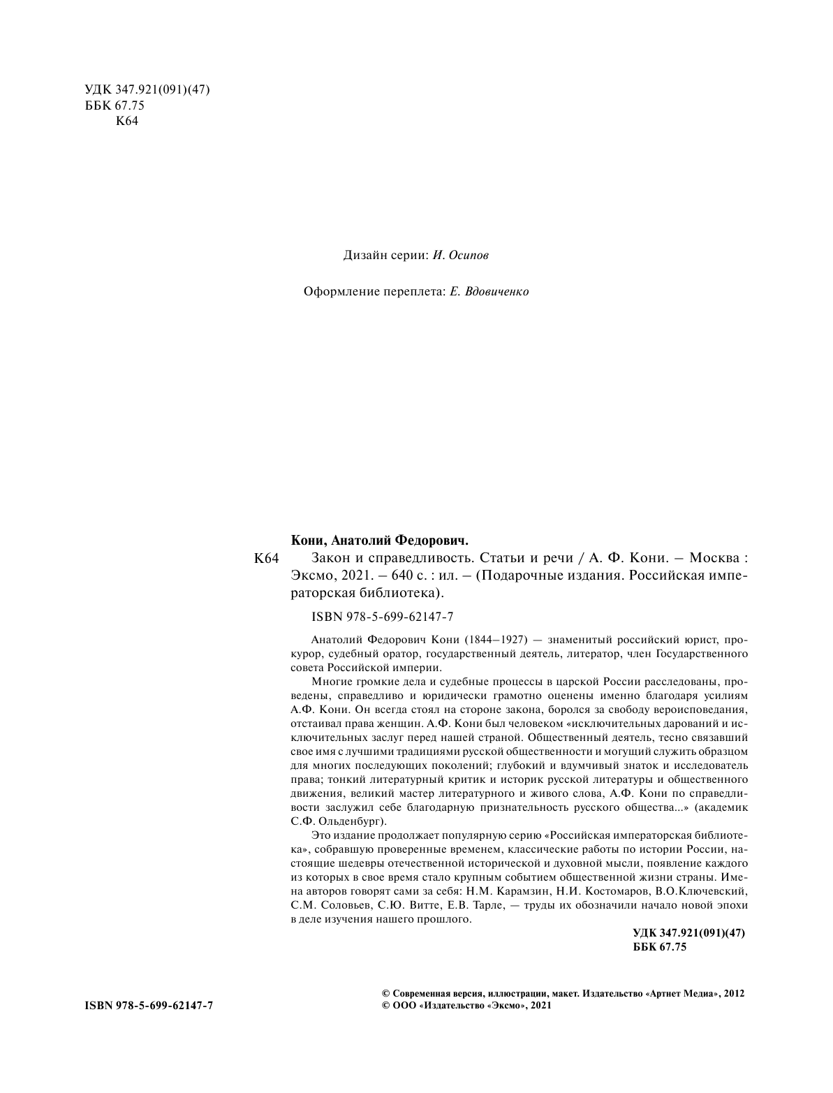 Закон и справедливость. Статьи и речи (Кони Анатолий Федорович); Эксмо, 2021