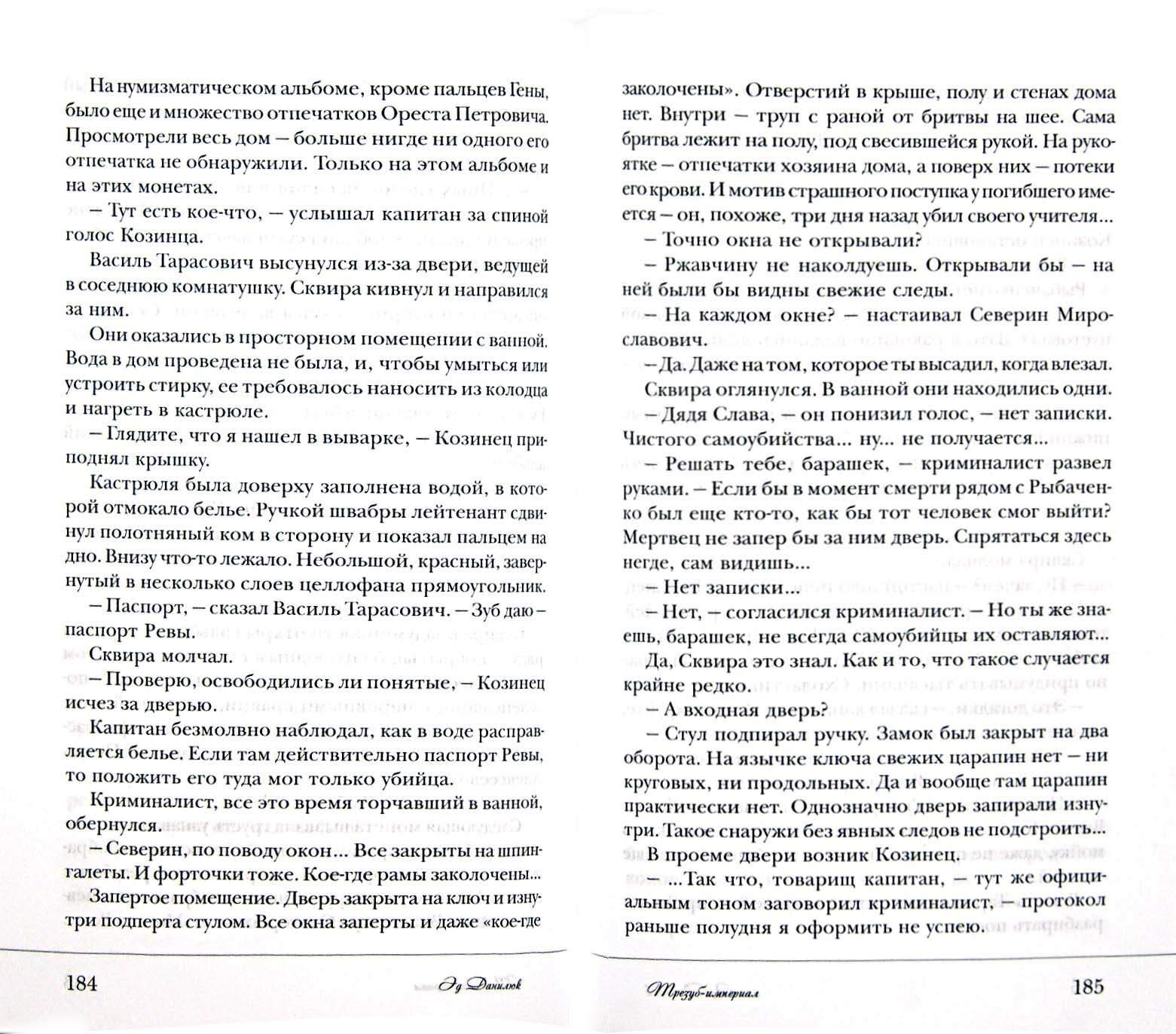 Несомненной удачей автора является также и то, что ему удалось избежать штампов «ментовских» криминальных книжек. Нет в «Трезубе-империале» ментов. Нет героев (в смысле супергероев без страха и упрека). Нет криминальных авторитетов. Нет бандитов. Нет мафиозных чиновников. Нет разборок. Нет пошлых диалогов. Эта книга вполне могла быть напечатана в том самом 1982 году – это классический детектив, который не стыдно показывать любителям Мегрэ, Эркюля Пуаро, Перри Мейсона, Иоанны Хмелевской. Самый близкий аналог по стилю и духу, который мне приходит в голову, это, наверное, книги Дика Френсиса, хотя, конечно, Эд Данилюк несомненно уникален и самобытен.