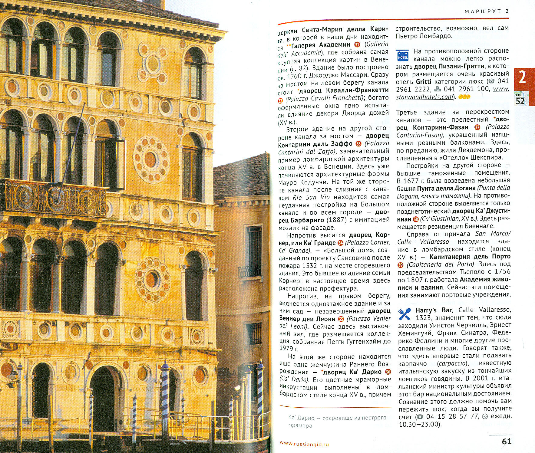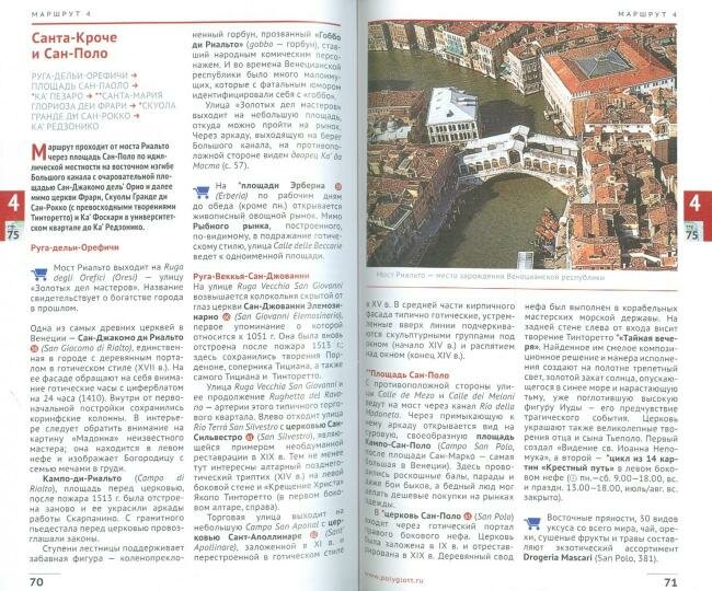 Качественный путеводитель, в духе издательства "Полиглот". Легкий, можно носить в дамской сумочке (что я и делала). Понравились все 8 маршрутов. Каждый из предложенных маршрутов снабжен подробной картой-схемой с указанием самого маршрута стрелками и основными достопримечательностями. По каждой достопримечательности даны основные сведения. Также предлагается информация для самостоятельной экскурсии по островам лагуны (чем знаменит остров, основные достопримечательности. Путеводитель хорош для первого знакомства с городом или для короткой поездки.