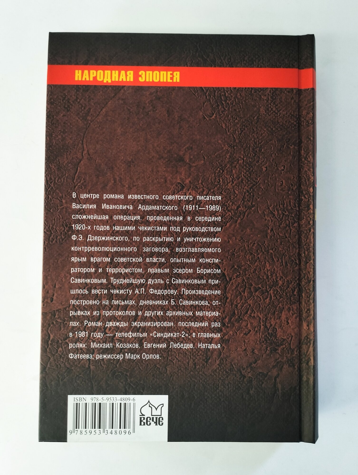 В центре повести известного советского писателя Василия Ивановича Ардаматского (1911-1989) сложнейшая операция, проведенная в середине 1920-х годов нашими чекистами под руководством Ф.Э. Дзержинского, по раскрытию и уничтожению контрреволюционного заговора, возглавляемого ярым врагом советской власти, опытным конспиратором и террористом, правым эсером Борисом Савинковым. Труднейшую дуэль с Савинковым пришлось вести чекисту А.П. Федорову. Произведение построено на письмах, дневниках Б. Савинкова, отрывках из протоколов и других архивных материалах. Повесть дважды экранизирована, последний раз в 1981 году - телефильм "Синдикат-2", в главных ролях: Михаил Козаков, Евгений Лебедев, Наталья Фатеева; режиссер Марк Орлов.