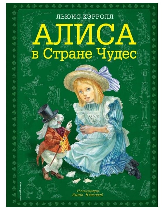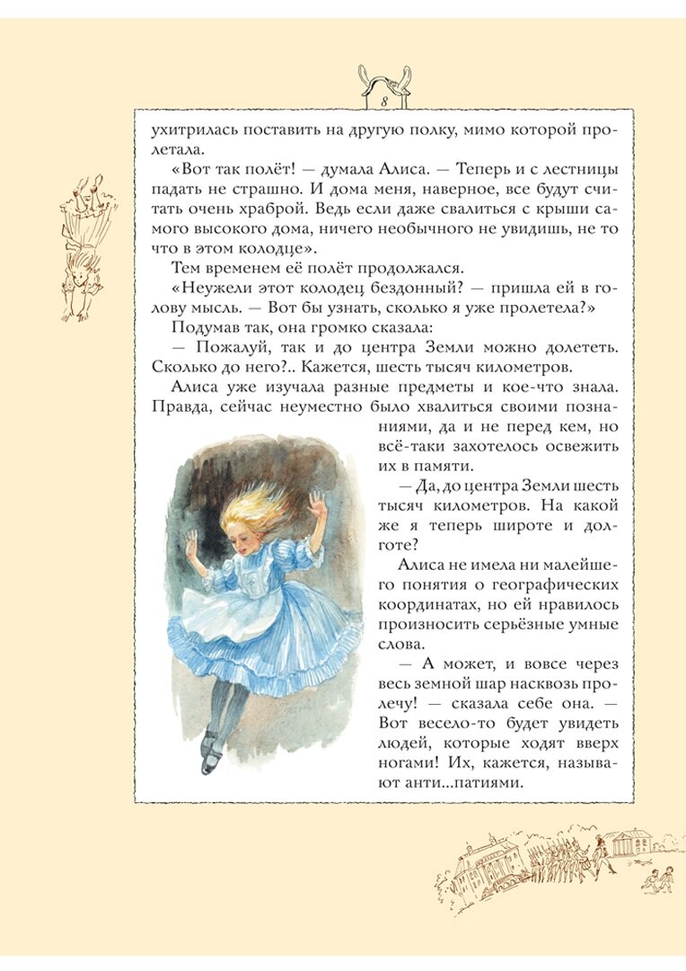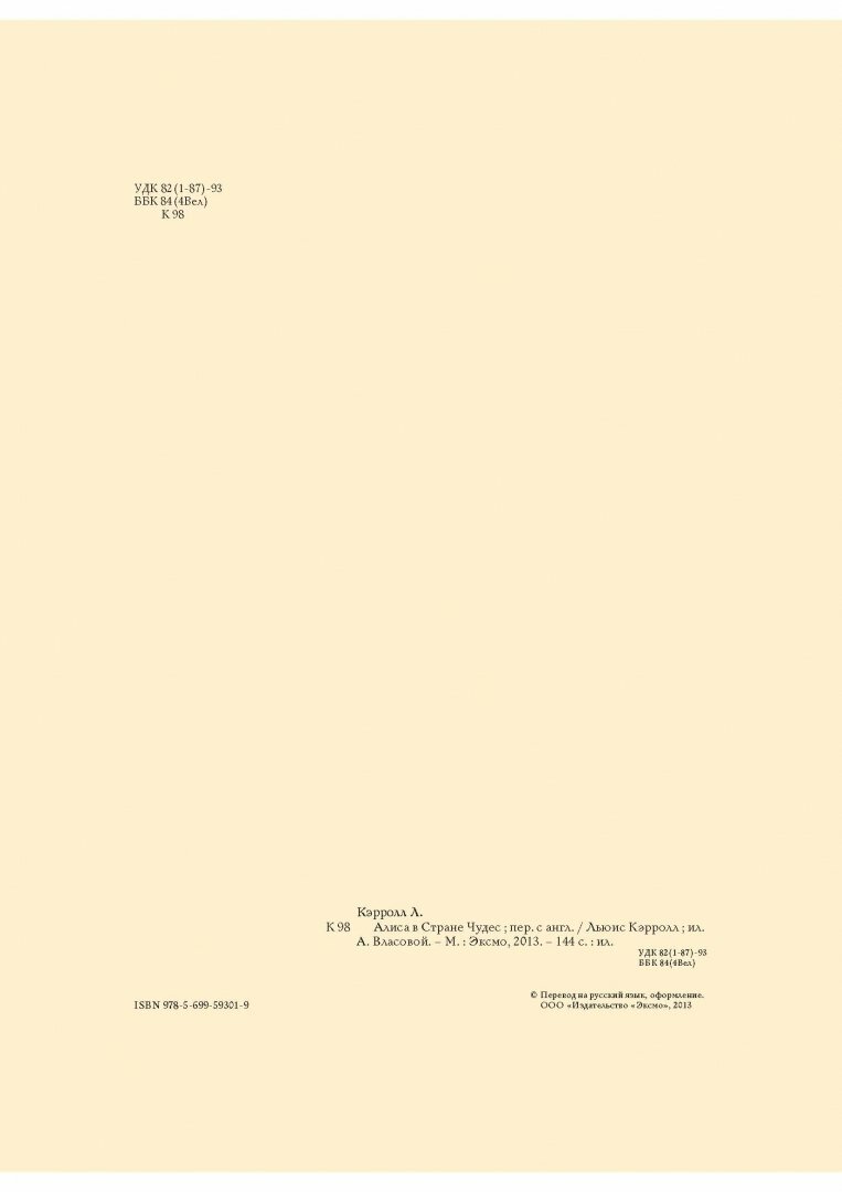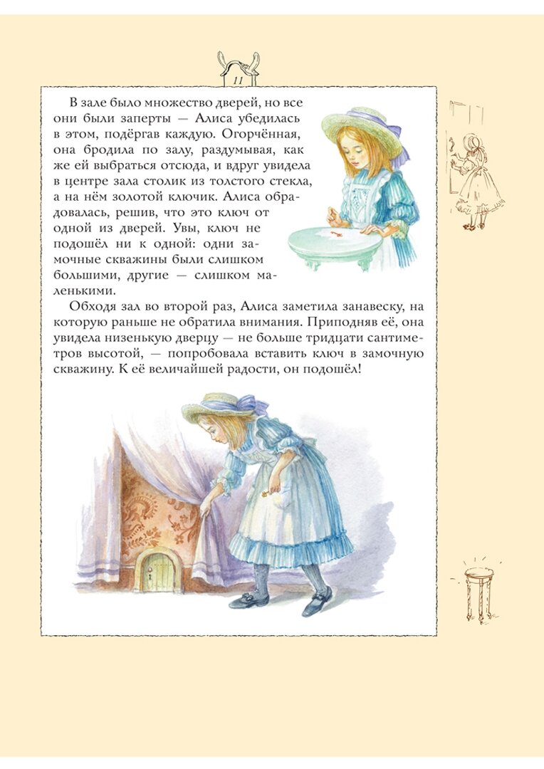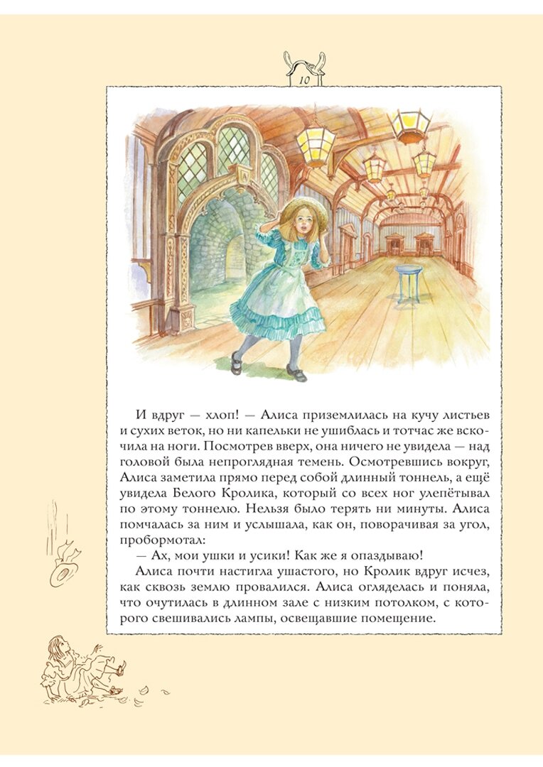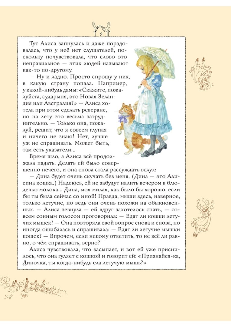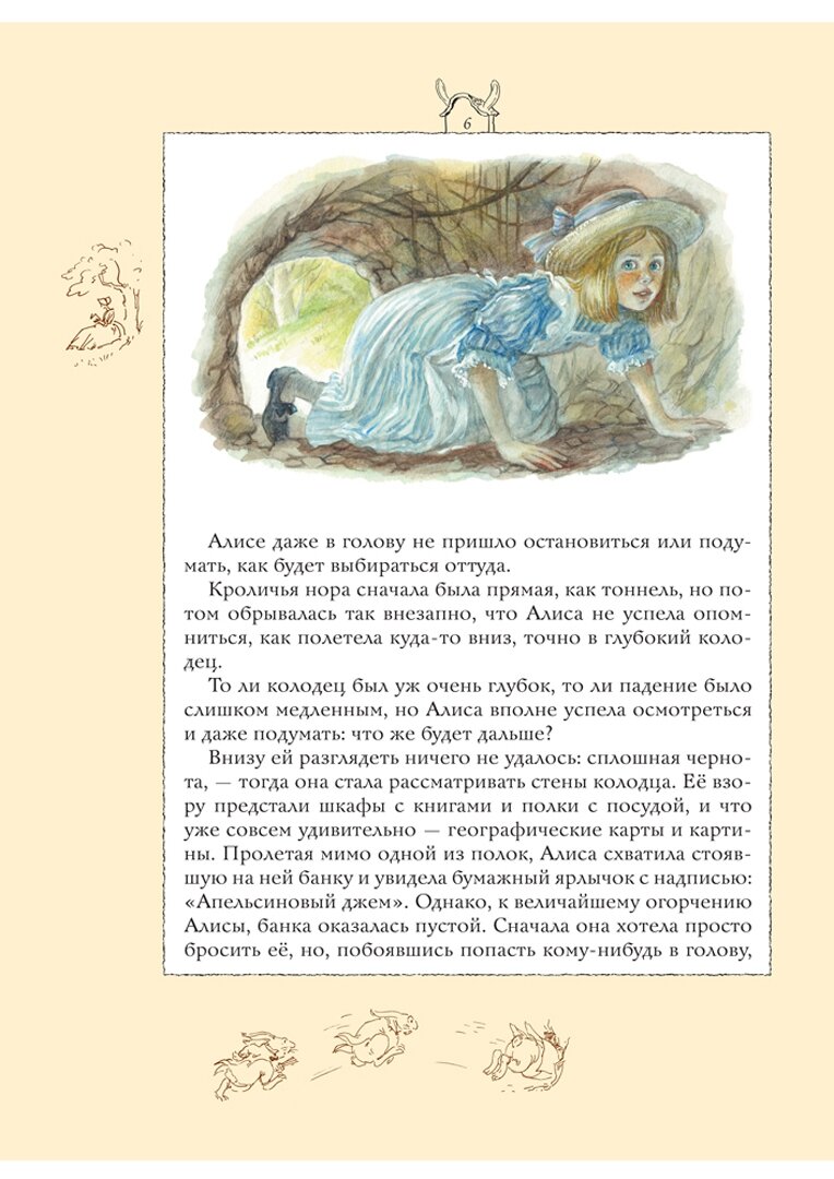 Книга огромного формата, гораздо больше А4, переплет твердый, глянцевый. Рисунок на обложке матовый, буквы золотые. Бумага хорошего качества, белая, офсетная. Текст напечатан на белом фоне, по краям рамки цвета топленого молока, довольно широкие. На полях маленькие коричневые картиночки, очень милые. Основные иллюстрации в классическом стиле, есть полностраничные, есть на разворот, а также встречаются картинки среди текста, выдержаны в неброских, пастельных тонах, в характерной манере А. Власовой. Ничего оригинального, новаторского или неожиданного в них нет, разве что впервые встречаю Алису в шляпке. Есть некоторые непонятные моменты - например, падает Алиса в море слез без шляпки, а плавает в шляпке. Еще есть пара настолько похожих картинок, что дочь поначалу приняла их за одну и ту же иллюстрацию на разных страницах. В моем экземпляре в одном месте книга плохо прошита, не натянуты нити. Но это пустяки, мелочи... В целом же книга получилась красивая.