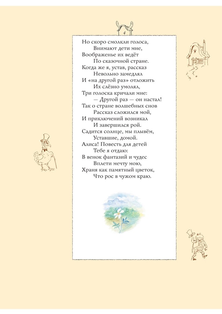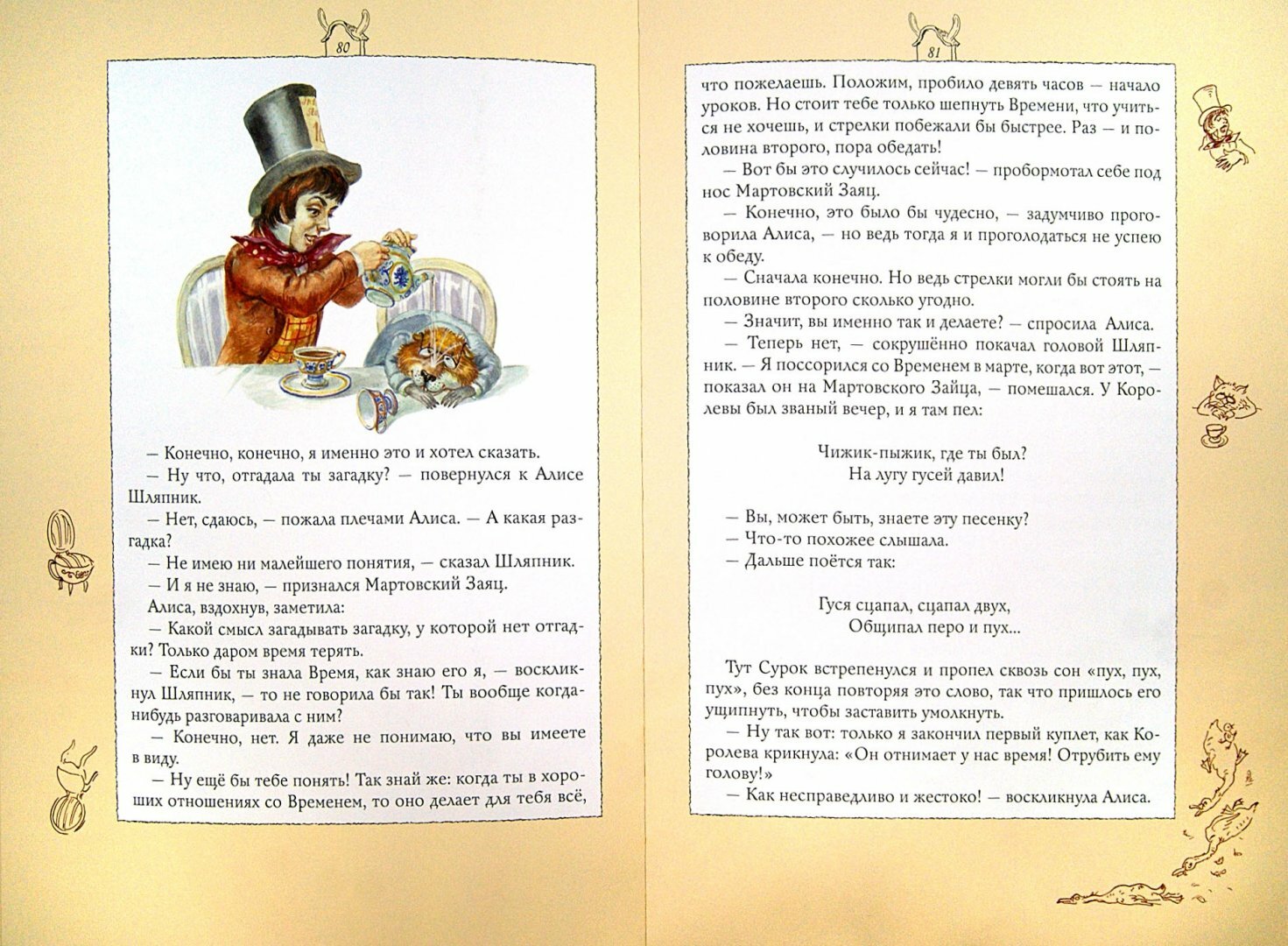Что касается перевода, то здесь он весьма загадочный, хоть и полный, а не сокращенный адаптированный пересказ. Во-первых, неизвестно, кто его автор. Во-вторых, перевод местами неожиданный. Например, сладко спящая мышь Соня здесь оказалась Сурком мужского пола. Перевод стихов мне тоже показался странным. Помните романс, который исполняет Болванщик (здесь он - Шляпник) - о крокодильчиках, цветиках речных? Здесь романс звучит так: