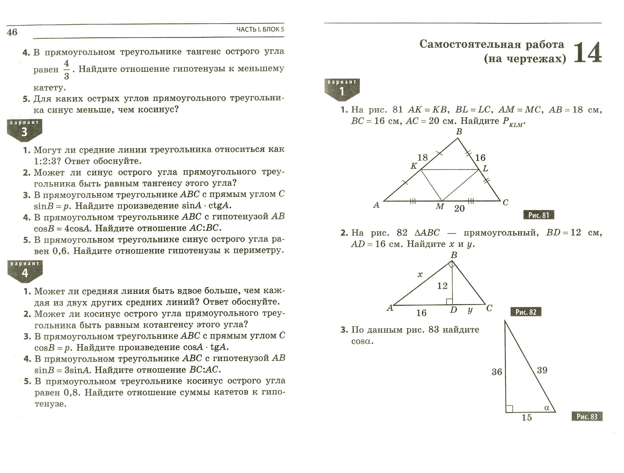 Самостоятельные работы разделены на 8 блоков, соответствующих основным этапам изучения геометрии в 8 классе. Каждый блок состоит из трех видов работ, реализующих различные дидактические цели, - работы по проверке теории, работы на готовых чертежах и письменные работы. В сборник также вошли 6 контрольных работ. Все работы состоят из 4 вариантов двух уровней сложности и предназначены для организации дифференцированного обучения и контроля в общеобразовательных и профильных школах.