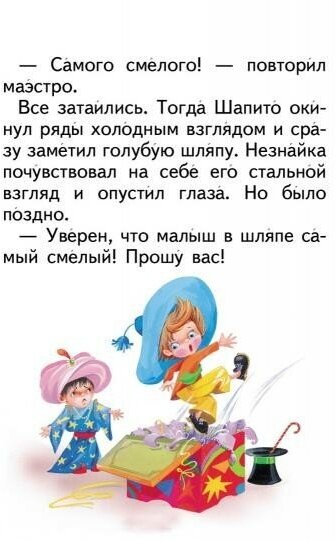 Мне кажется, картинок можно было бы побольше. Есть совершенно белые развороты. Но качество бумаги и печати отличное, очень плотные белоснежные листы, большой шрифт. Наличие ударение и отсутствие разделения на слоги - два больших "ЗА" то, чтобы дать именно эту книгу одной из первых для самостоятельного чтения маленькому любителю Незнайки.
