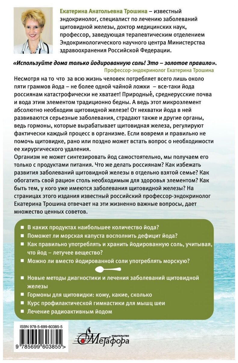 Организм не может синтезировать йод самостоятельно, мы получаем его только с продуктами питания. Что же делать россиянам? Как избежать развития заболеваний щитовидной железы в отдельно взятой семье? Как обогатить свой рацион столь необходимым для здоровья элементом? Как быть тем, у кого уже имеются заболевания щитовидной железы? На страницах этого издания известный российский профессор-эндокринолог Екатерина Трошина отвечает на эти жизненно важные вопросы, дает множество ценных советов.