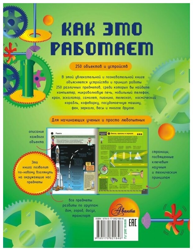 В этой увлекательной и познавательной книге объясняется устройство и принцип работы 250 различных предметов, среди которых вы найдете: компьютер, микроволновую печь, мобильный телефон, кран, эскалатор, самолет, пианино, телескоп, космический корабль, кофеварку, посудомоечную машину, фен, зеркало, весы и многое другое.