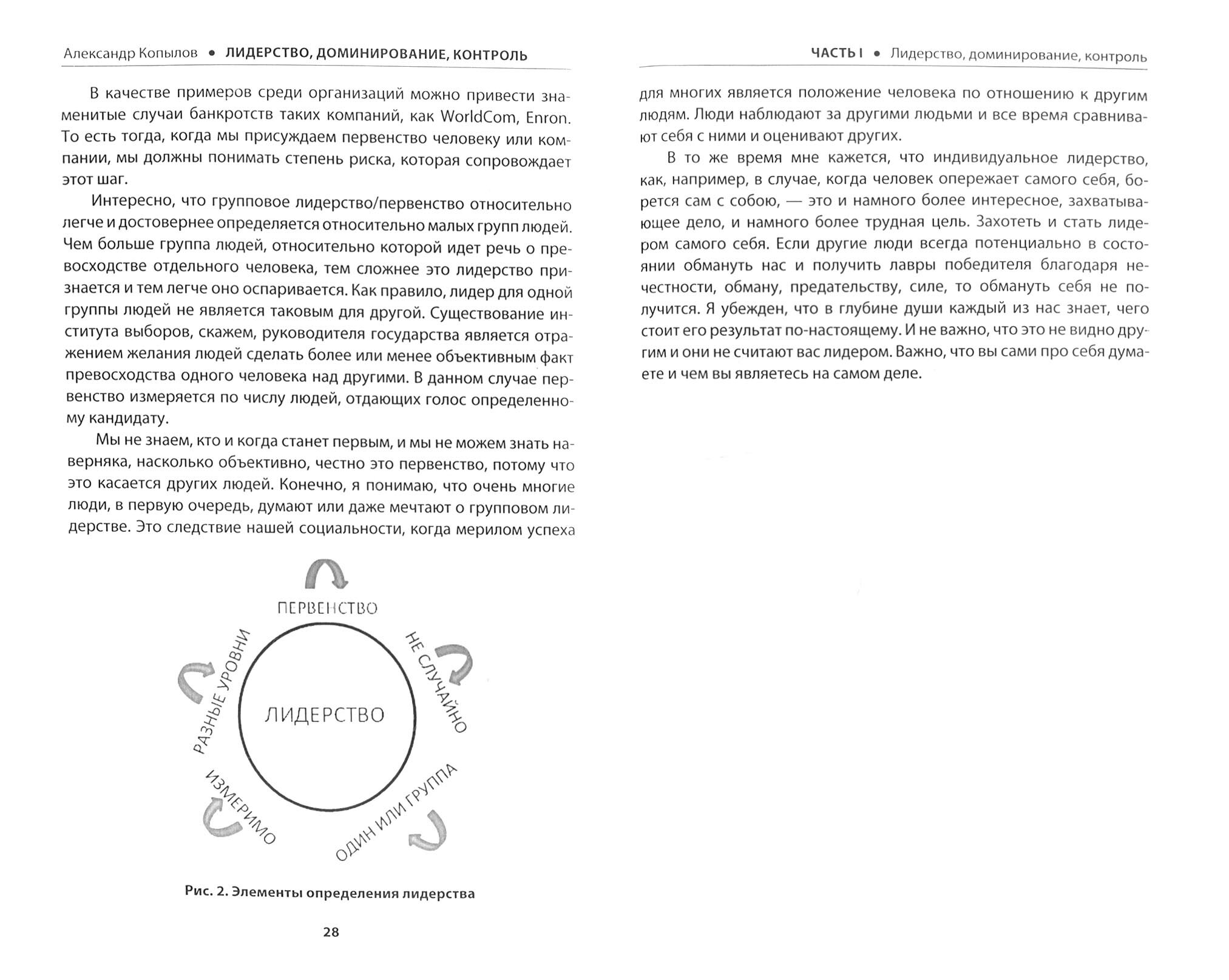 Автор книги сравнивает разные определения лидерства и показывает, что в максимально широком толковании лидерство можно считать просто синонимом руководства, особенно на высоком уровне. Однако такое понимание слишком девальвирует определение лидерства и делает его непрозрачным. Кроме того, важно учитывать взаимосвязь лидерства с доминированием и контролем, которым автор также дает собственные определения.