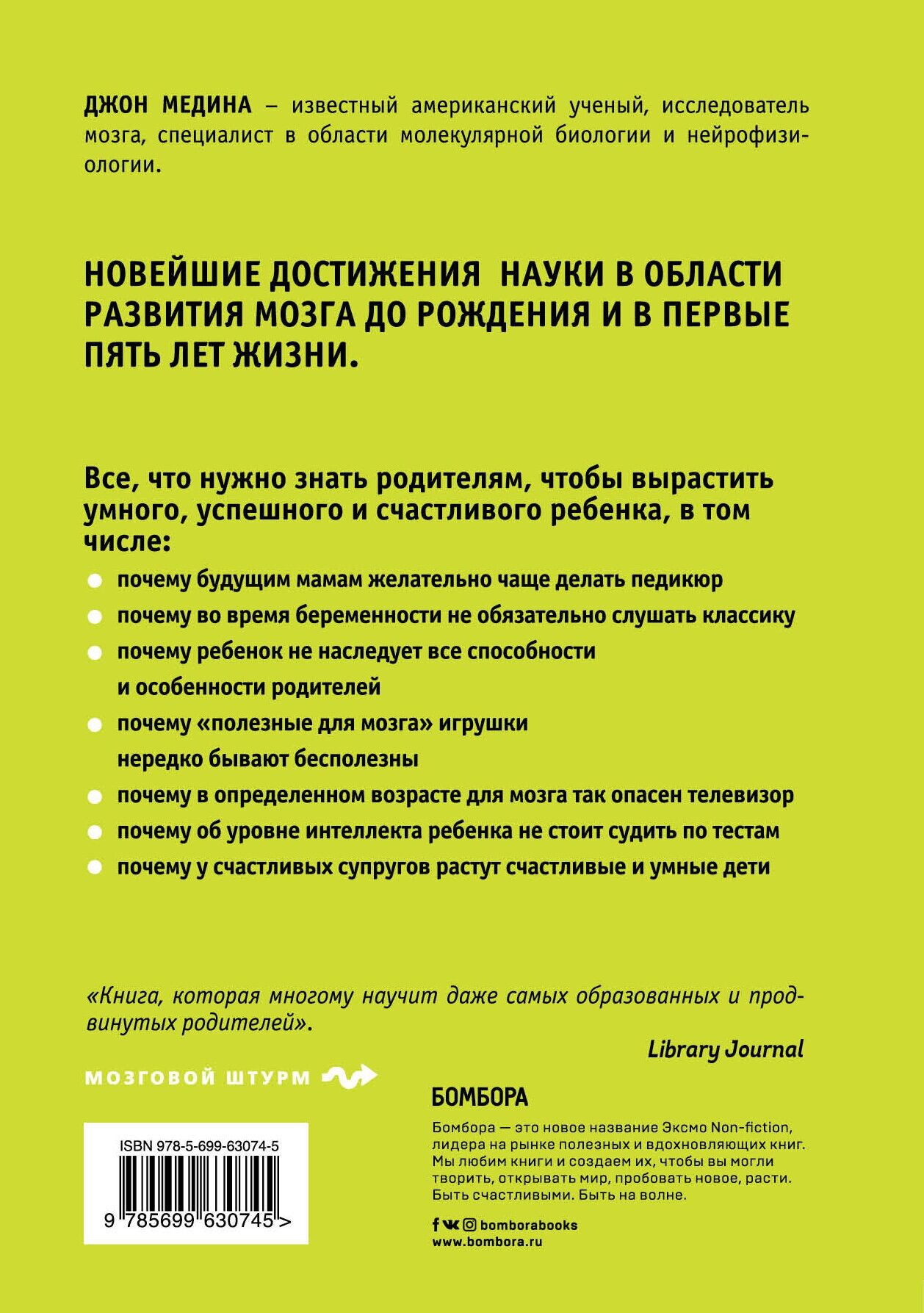 Основная идея книги: воспитание ребенка - это в первую очередь развитие его мозга, включая внутриутробный период. Исходя из этого, Дж. Медина объясняет, что и как следует делать родителям до и после рождения малыша, чтобы вырастить умного, целеустремленного, счастливого, этически состоятельного человека. Внимание уделяется не только воспитанию и раннему развитию, но и здоровым отношениям в семье. Интересно выглядит развенчивание таких популярных мифов как: "если во время беременности слушать классику, ребенок родится более развитым, "чем больше "полезных для мозга" игрушек, тем лучше" и др.