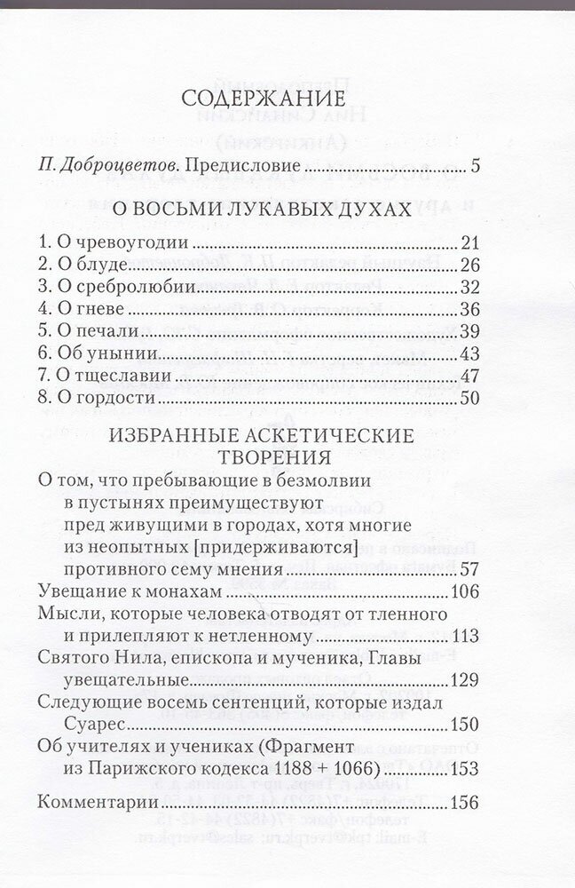 Преподобный Нил Синайский (Анкирский) - ученик свт. Иоанна Златоуста и великий отец Синайской пустыни. В книге помещены его нравственно-аскетические произведения: "О восьми лукавых духах", "О том, что пребывающие в безмолвии в пустынях преимуществуют пред живущими в городах", "Увещание к монахам", "Мысли, которые человека отводят от тленного и прилепляют к нетленному", "Главы увещательные", "Об учителе и учениках". Преподобный Нил Синайский вслед за Евагрием Поптийским развивает известную классификацию восьми основных греховных помыслов (страстей): чревоугодие, блуд, сребролюбие, гнев, печаль, уныние, тщеславие и гордость. Его тонкий аскетико-психологический анализ этих страстей помогает христианину успешно бороться с ними и совершенствоваться внутренне, что делает книгу полезной как для монашествующих, так и для самого широкого круга православных читателей.