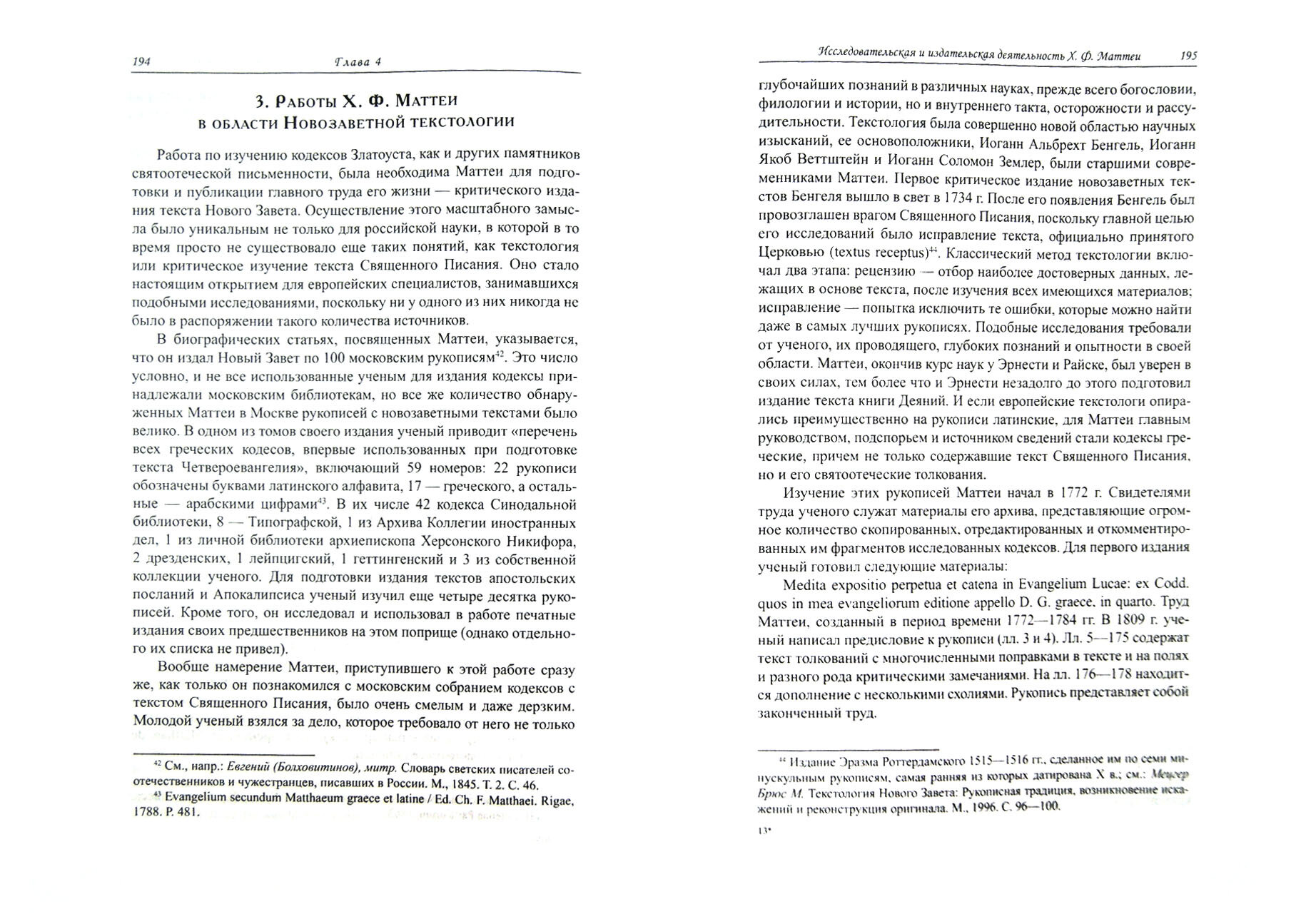 Жизнь и труды X. Ф. Маттеи (1744-1811) принадлежат одной из ярчайших страниц истории русско-немецких научных и культурных связей. Этот ученый стоял у истоков преподавания древней словесности в Московском университете, а его научные изыскания внесли значительный вклад в развитие и европейской, и российской науки. К числу его заслуг принадлежат создание первого полного печатного каталога греческих рукописей московских Синодальной и Типографской библиотек, публикация многих не изданных до того времени сочинений античной и святоотеческой письменности, критические издания текстов Священного Писания. Однако, несмотря на богатство научного наследия X. Ф. Маттеи, его фигура до сих пор остается вне рамок своей эпохи, за пределами истории европейской науки и культуры рубежа XVIII - XIX столетий. В предлагаемом исследовании во всей возможной полноте восстановлена биография X. Ф. Маттеи, дана оценка его деятельности как педагога, ученого и одного из первых коллекционеров манускриптов своего времени, установлено происхождение рукописей его собрания. В приложении впервые публикуются сохранившиеся части его переписки с Д. Рункеном и М. Н. Муравьевым.