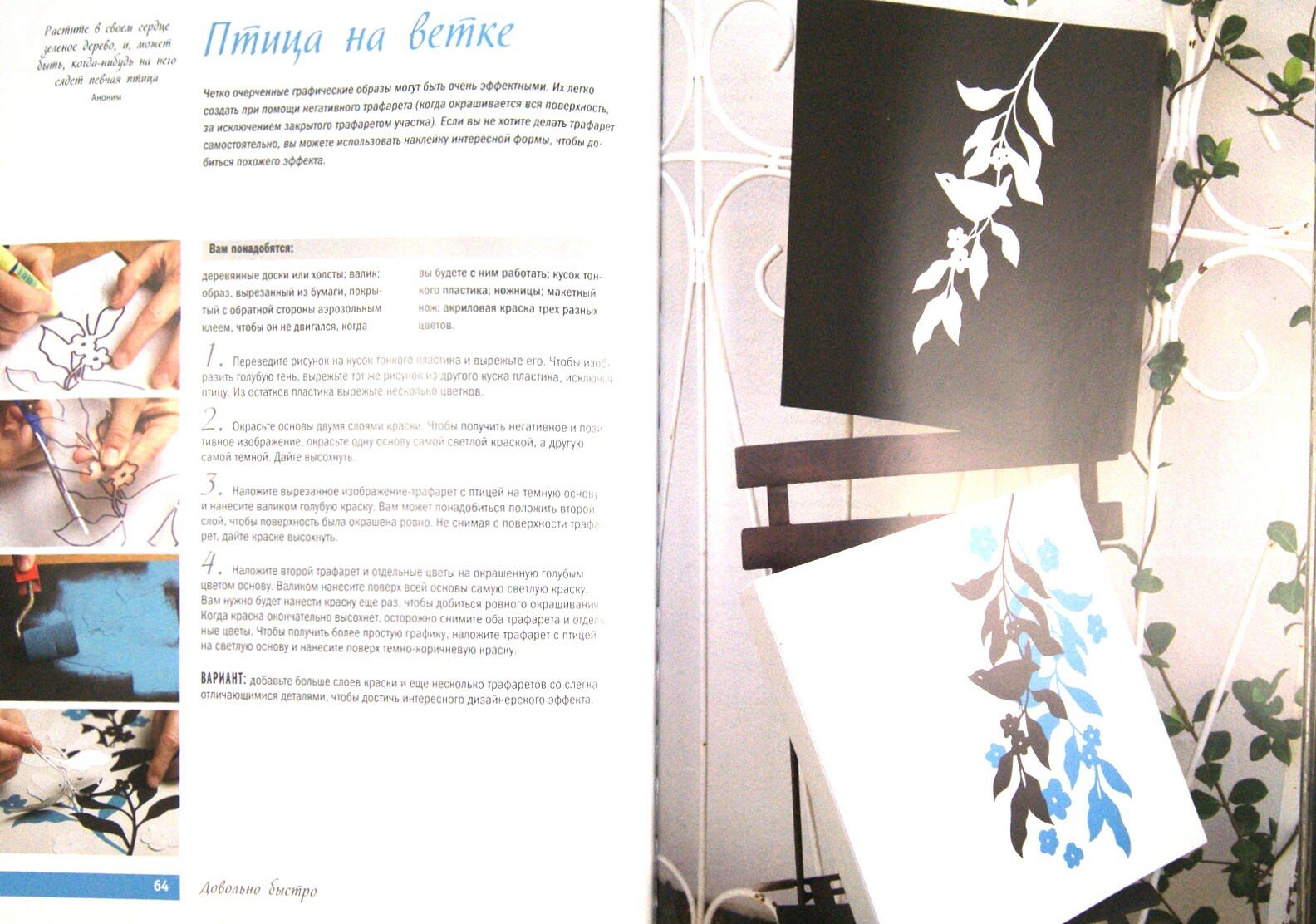 Художники и дизайнеры Энджи Франк и Моник Дэй-Уайльд у себя на родине много лет ведут курс декорирования интерьера и, совершив много удивительных открытий, достигли в этой области невероятного мастерства. Авторы нескольких популярных книг, они предлагают нашему вниманию новую, которая научит эффектно декорировать любую поверхность. В книге 50 мастер-классов, девиз которых «делать быстро и красиво!». А если точнее - «фантастически быстро» (менее получаса), «довольно быстро» (больше часа) и просто «быстро» (несколько часов). Единственное, что замедляет работу, - скорость высыхания краски. В каждом мастер-классе четыре шага, иллюстрации и подробное описание дают полное представление о рабочем процессе. Максимальный результат при минимуме усилий - это не может не вдохновлять!