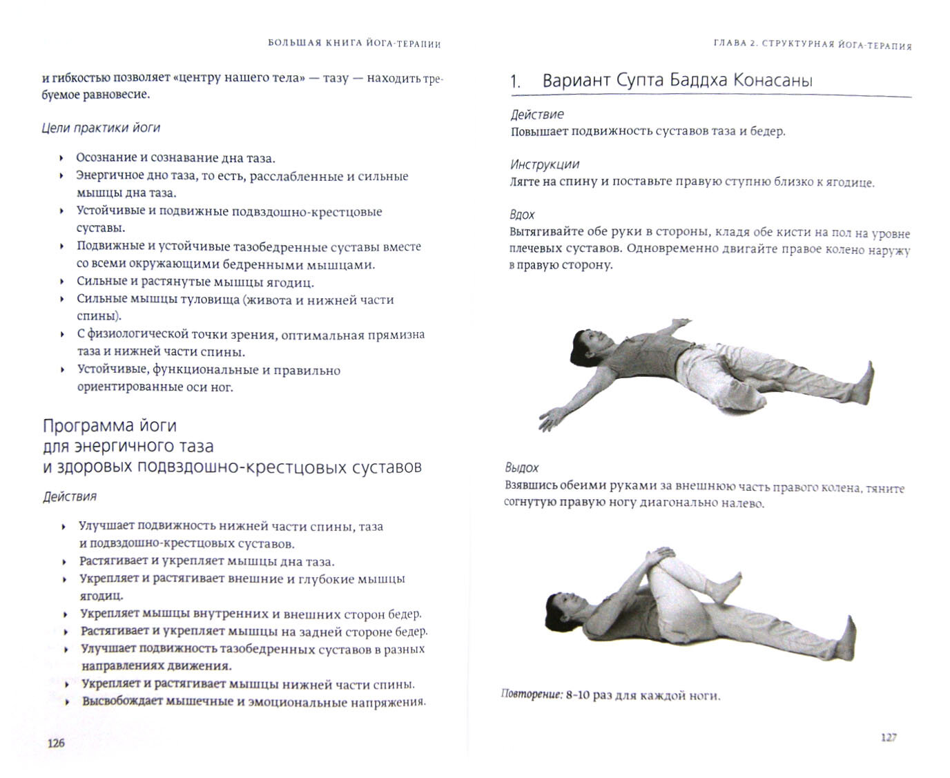 1) Терапевтический эффект описан только в ортопедических аспектах (про кости и связки). Влияния йоги на внутренние органы книга не касается. 2) Асаны выпоняются в движении (не статически), то есть, это не классическая йога.