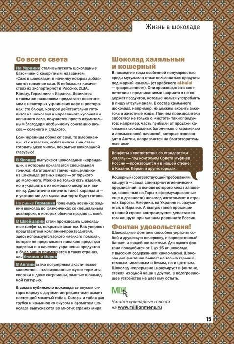 Небольшая ,но очень содержательная книга. С начала написан рассказ о появлении и названии,история шоколада ,короче .Затем много интересных фактов и все они систематизированы,на каждом развороте новая тема.Поэтому после прочтения первых листов ,я узнала о шоколаде практически все. Затем идут рецепты и на странице с каждым рецептом приведен небольшой факт или дополнительная информация. Но рецепты мне не очень понравились ,есть своеобразные,а так же почти в каждом молочный шоколад (ну зачем он мне нужен ?!)думаю просто заменять его на обычный. А так задумки в рецептах интересные. Купить однозначно стоит тем кто любит сладкое ,особенно шоколад,просто для интереса.
