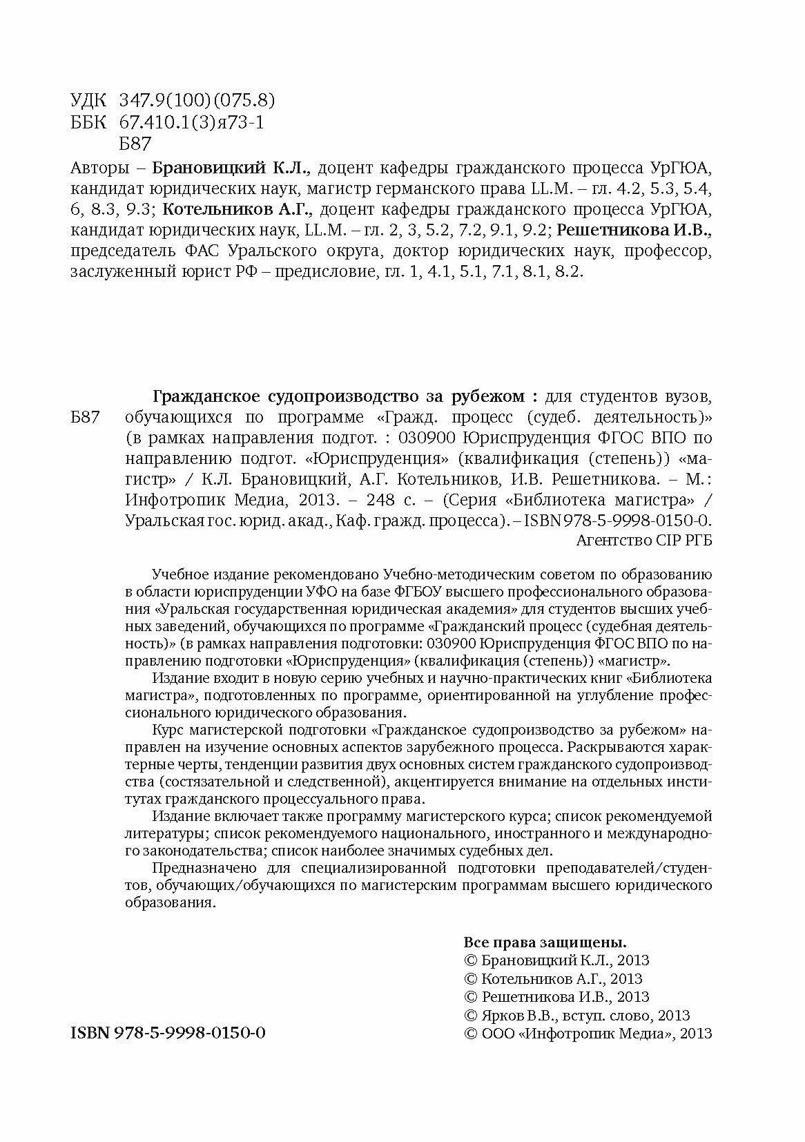 Гражданское судопроизводство за рубежом: для студентов вузов (Решетникова И. В., Брановицкий Константин Леонидович, Котельников А. Г.); Инфотропик, 2013