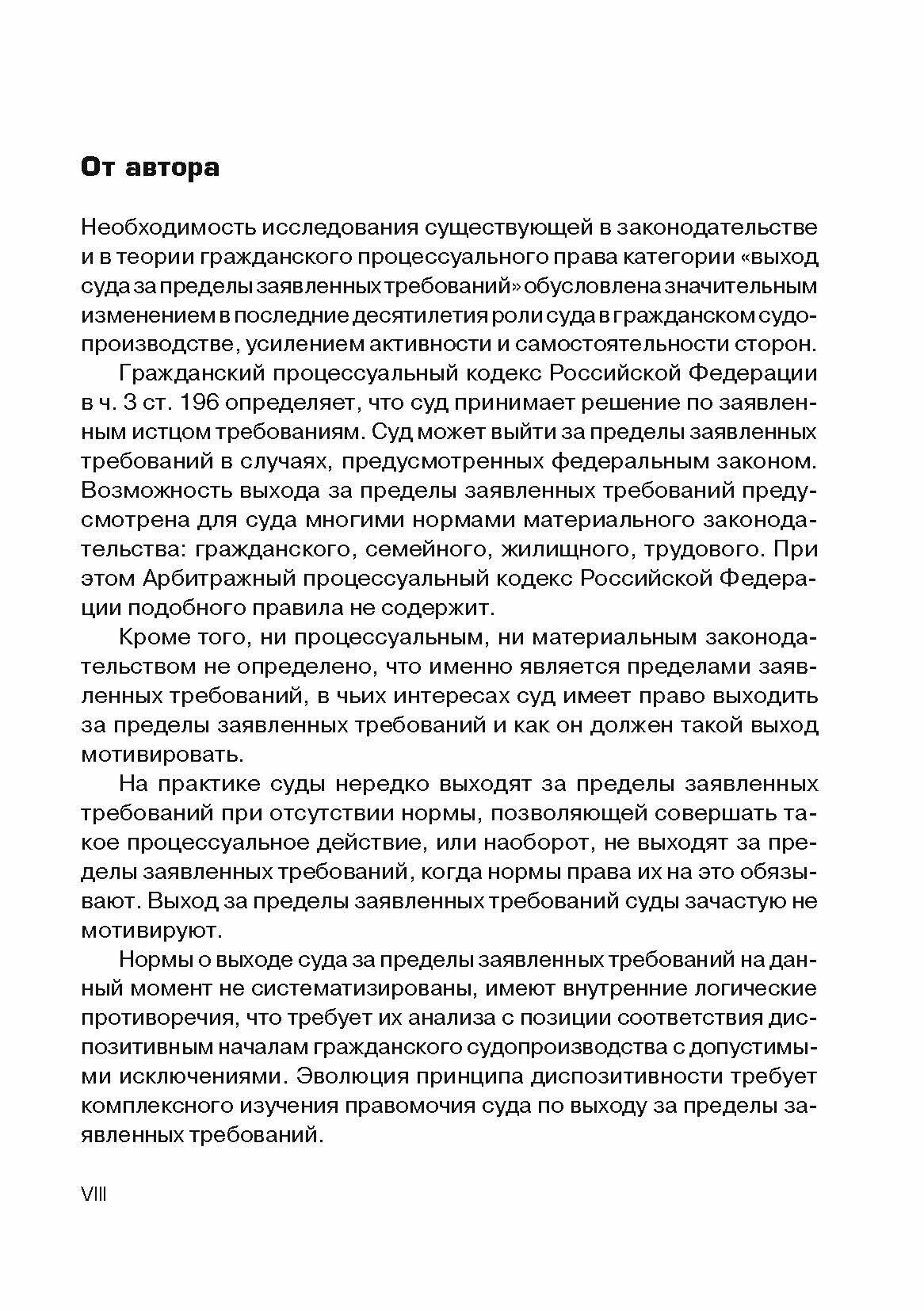 Книга - комплексное исследование полномочия суда по выходу за пределы заявленных требований. Анализируемое процессуальное действие рассмотрено в механизме правового регулирования в целом, а затем полученные выводы применены к каждому конкретному предусмотренному законом случаю выхода суда за пределы заявленных требований.