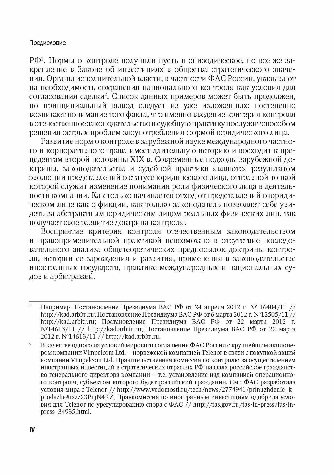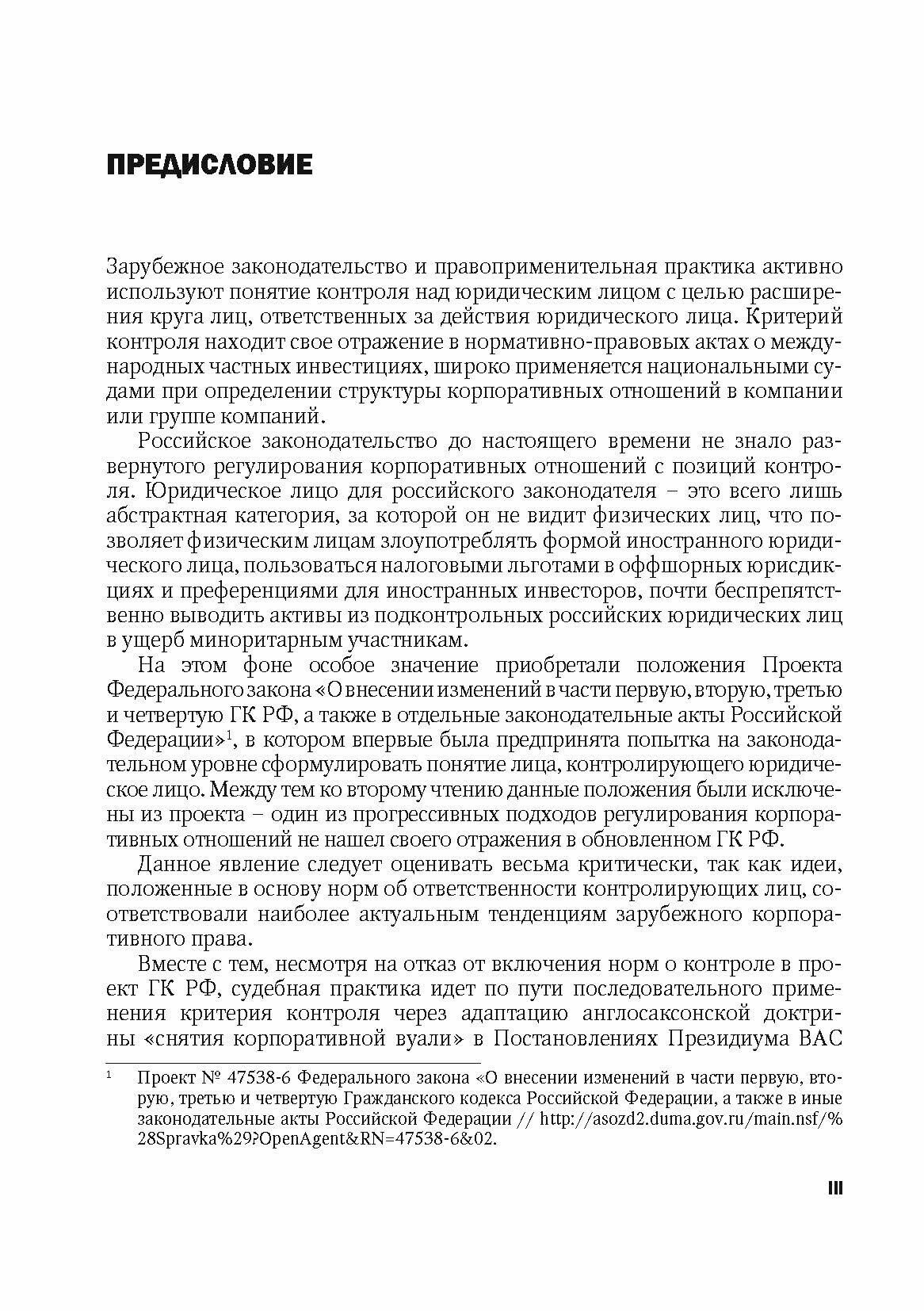 Контроль за корпорациями и проблемы, связанные с ответственностью бенефициаров юридического лица, являются предметом активного обсуждения специалистами в рамках противодействия выводу российских активов в иностранные юрисдикции. Несмотря на отказ от включения норм о контроле в проект "нового" ГК РФ, российская судебная практика встает на путь последовательного применения критерия контроля через адаптацию англосаксонской доктрины "снятия корпоративной вуали". Через анализ общетеоретических предпосылок доктрины контроля, истории ее развития, применения в законодательстве иностранных государств, практике международных и национальных судов и арбитражей, норм об ограничениях и ответственности в российском праве и использования критериев контроля в судебной практике в России автор приходит к интересному выводу. Какому? Читайте в этой книге. Для юристов, обслуживающих бизнес, экспертов по корпоративному праву.