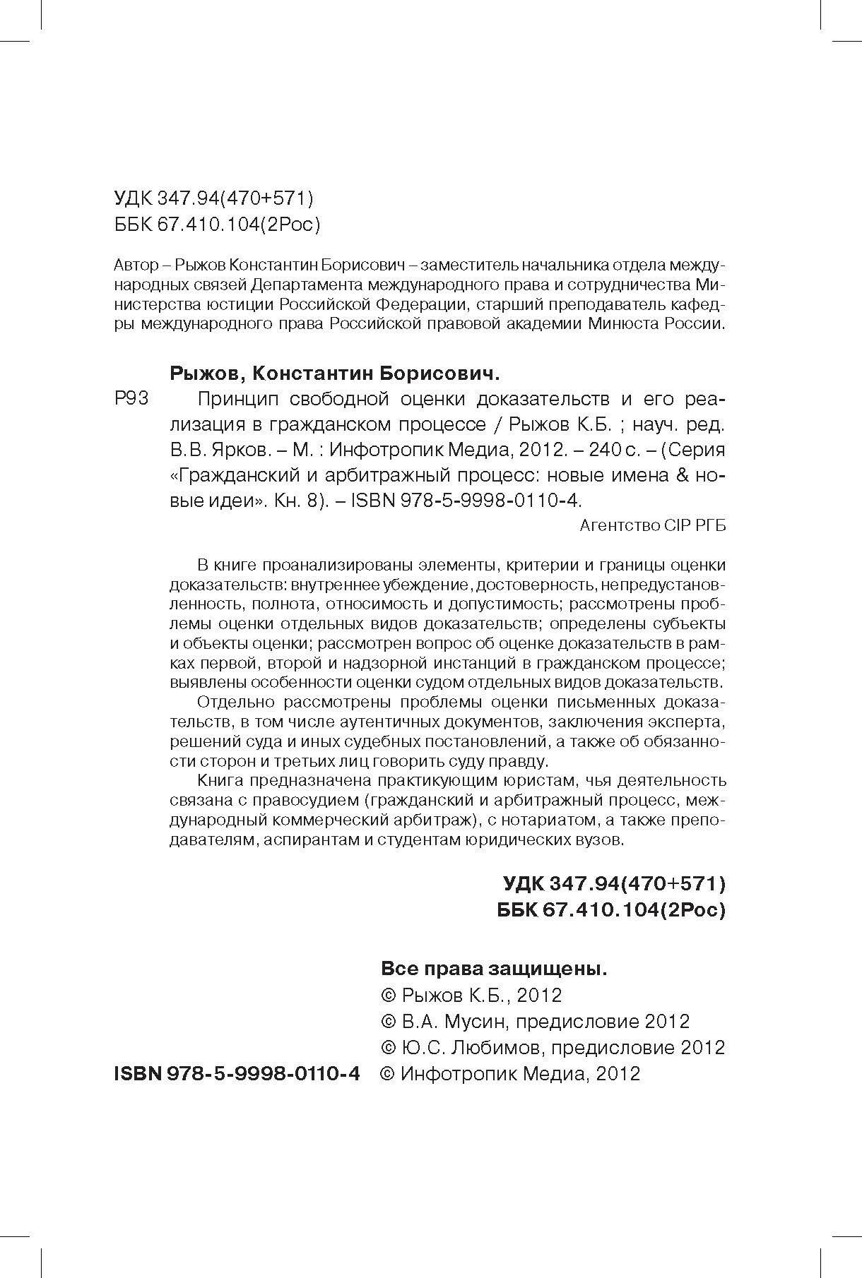 Принцип свободной оценки доказательств и его реализация в гражданском процессе (Рыжаков Константин Борисович); Инфотропик, 2012
