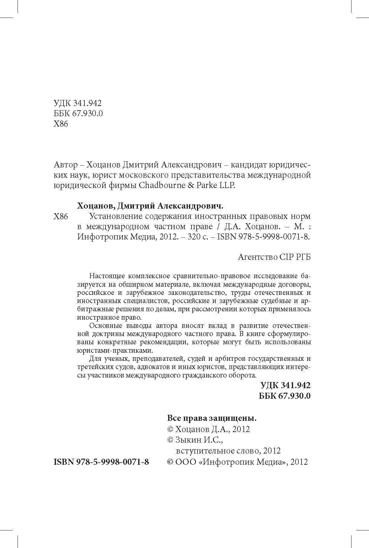Установление содержания иностранных правовых норм в международном частном праве (Хоцанов Дмитрий Александрович); Инфотропик, 2012