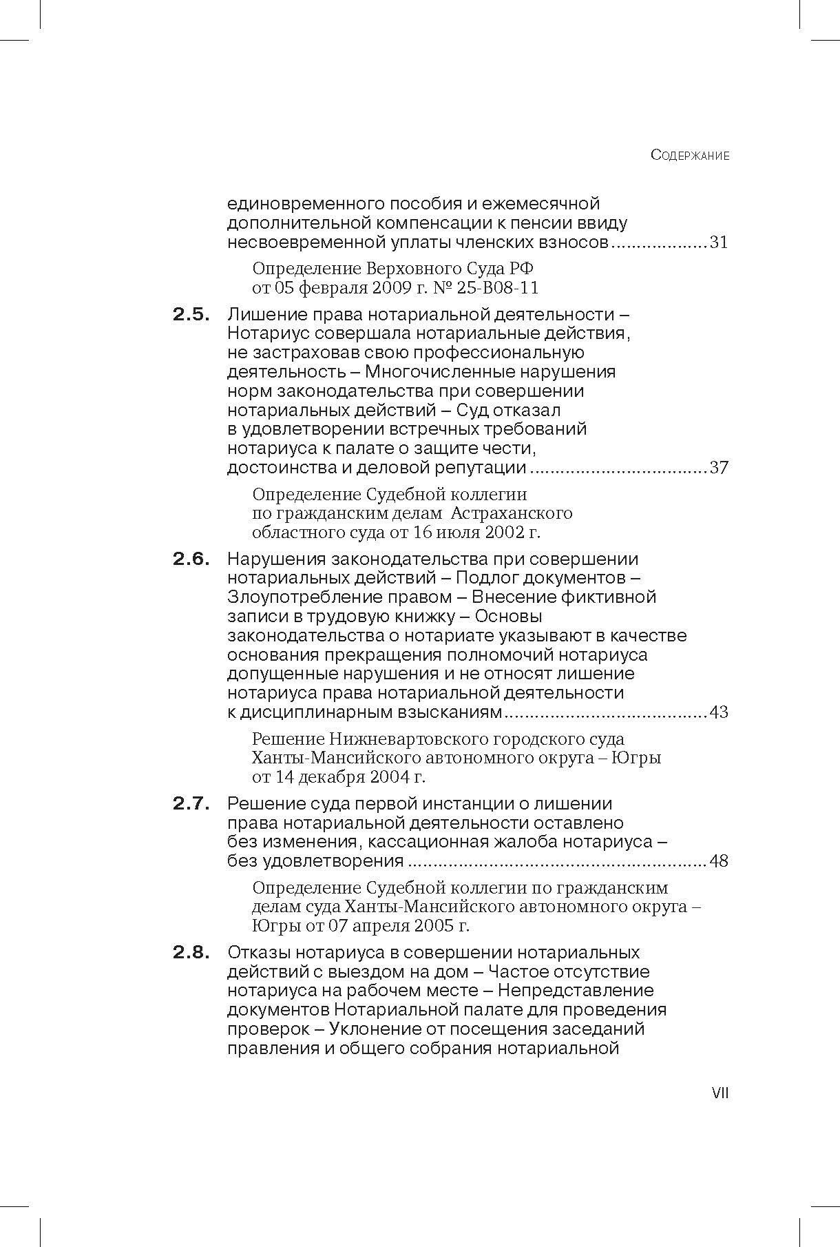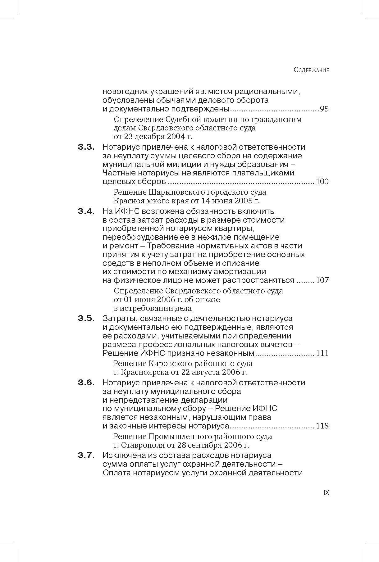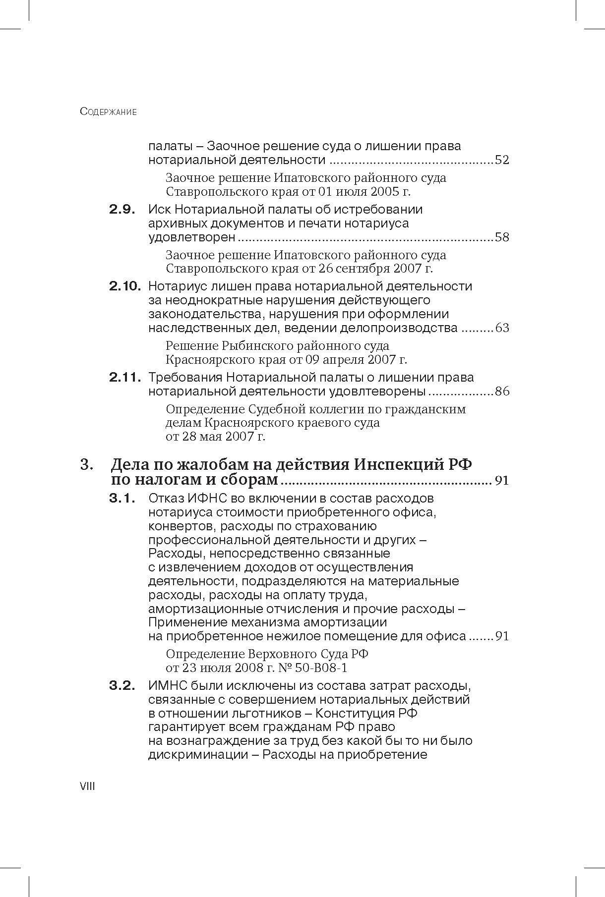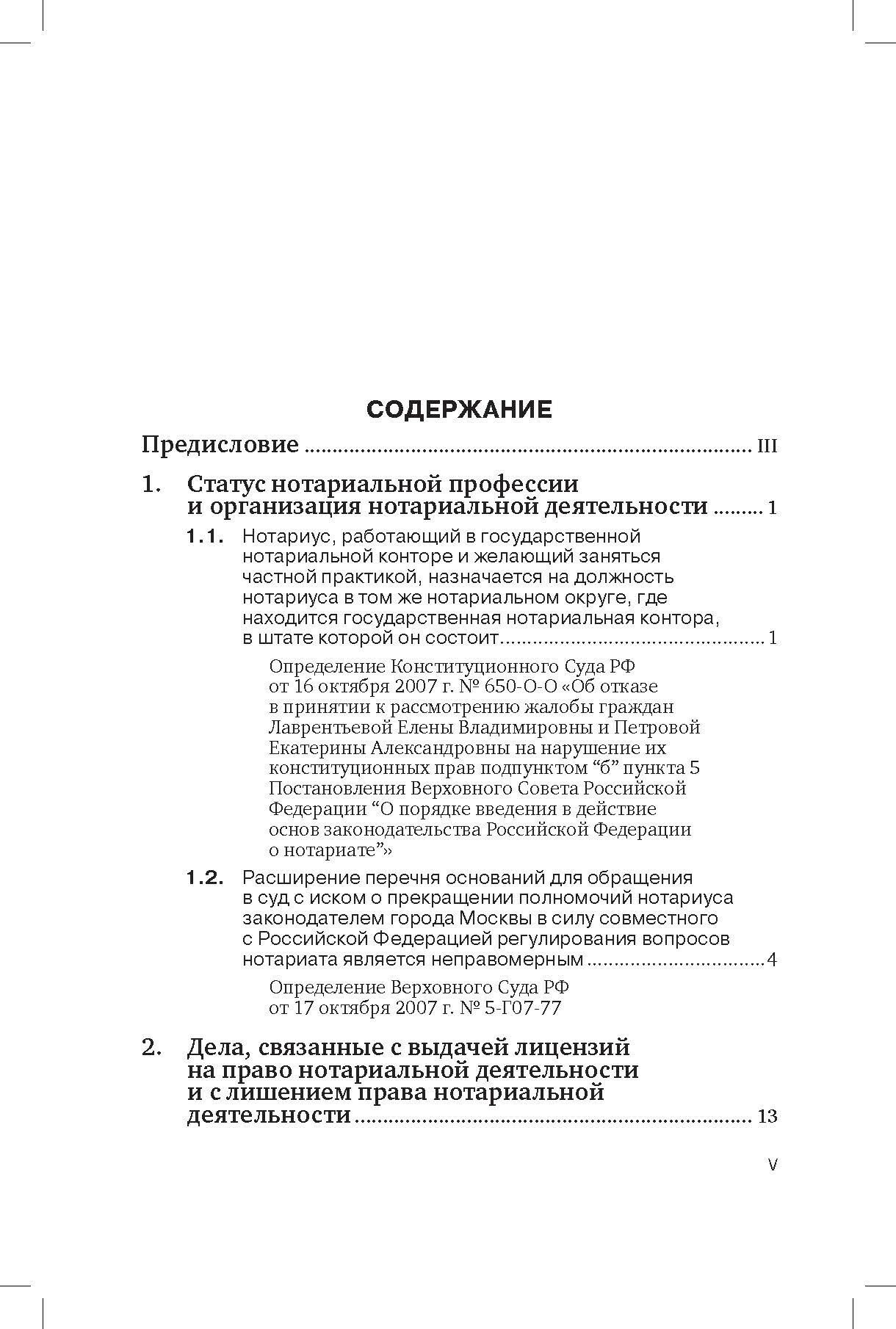 Судебные акты сгруппированы по 17 тематическим разделам: организация нотариальной деятельности; дела, связанные с выдачей лицензий и с лишением права нотариальной деятельности; налогообложение нотариусов; дела по жалобам на действия инспекций РФ по налогам и сборам; по жалобам на отказы в совершении нотариальных действий и по жалобам на действия нотариуса; дела, связанные с взысканием тарифов за совершение нотариальных действий; с удостоверением доверенностей; завещаний; договоров; о защите чести и достоинства; с применением земельного; семейного; жилищного законодательства; норм международного частного права; оформление наследственных прав; протест векселей; иные.