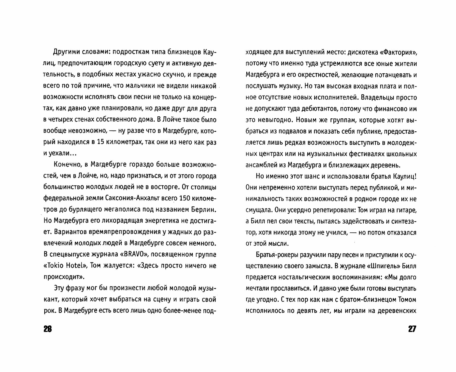 Книга о четырёх талантливых мальчиках из простых семей, которые благодаря упорству, целеустремлённости и крепкой дружбе за невероятно короткие сроки прославились на весь мир. В книге описана биография каждого из участников Tokio Hotel, истории создания первых песен, клипов, альбомов группы. Мне, как давней поклоннице TH было интересно проводить параллель между настоящим и прошлым Билла, Тома, Георга и Густава. Очень жаль, что авторы книги не выпустили продолжение биографии, ведь после написания этой книги в жизни группы произошло очень много событий, достойных внимания!