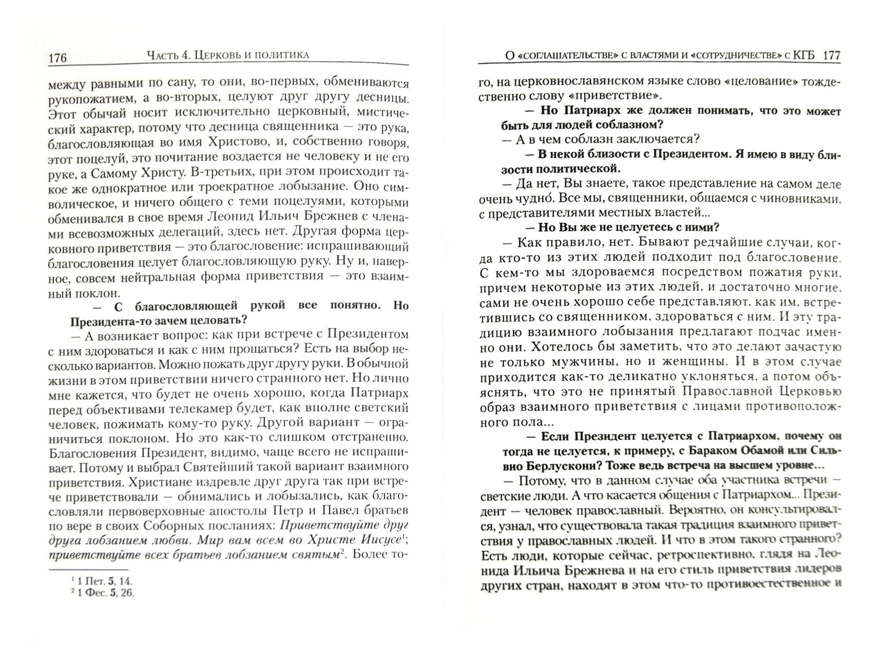 Формат беседы выбран удачно и неслучайно, как мне кажется. Журналист задает острые вопросы - о деньгах в Церкви, об отношениях Церкви с государством, о возвращении церковной недвижимости, про язык богослослужения, о геях и толерантности, о Церкви в СМИ и прочем-прочем.