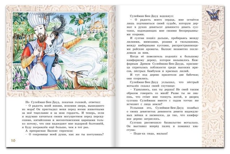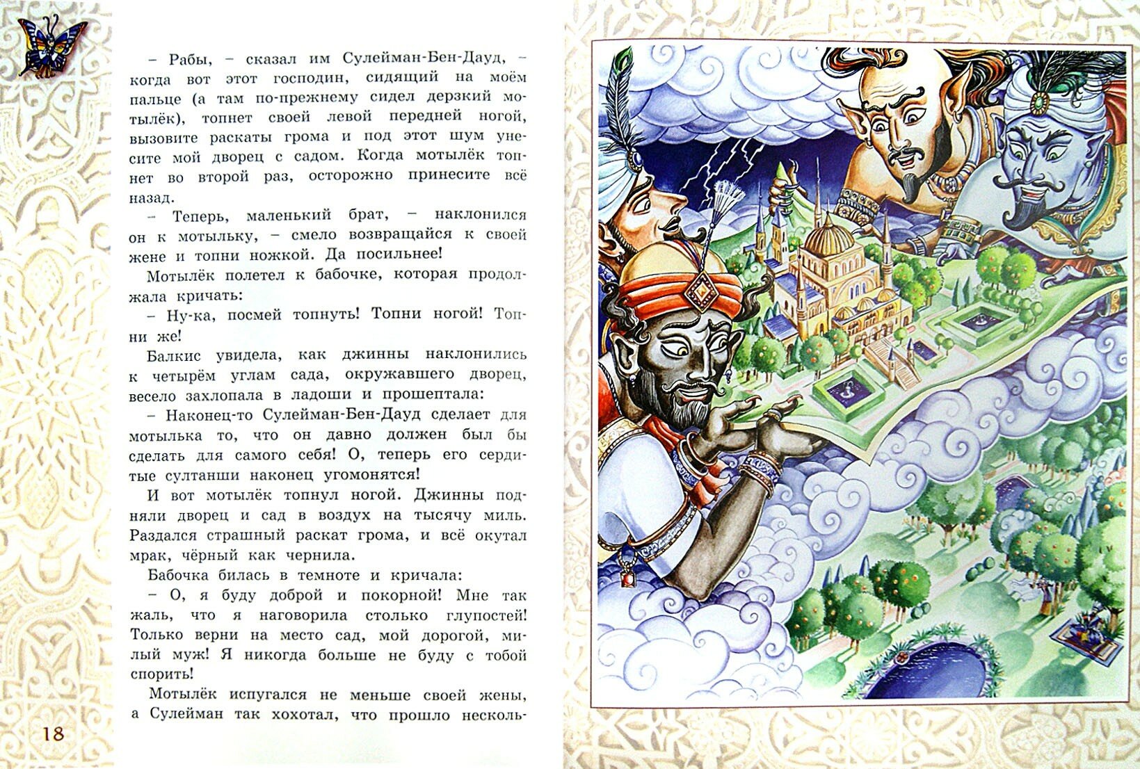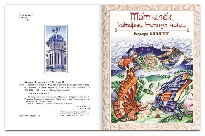 В сборник вошли авторские сказки известных европейских писателей, вдохновленных мудростью Востока: "Мотылёк, который топнул ногой" Редьярда Киплинга, "Соловей" Ганса Христиана Андерсена и "Калиф-аист" Вильгельма Гауфа. Юных читателей ждет встреча с халифами и визирями, принцессами и волшебниками, говорящими зверями и диковинными птицами. Филигранные по прорисовке иллюстрации Аси Любимовой делают книгу похожей на восточный ковер ручной работы.