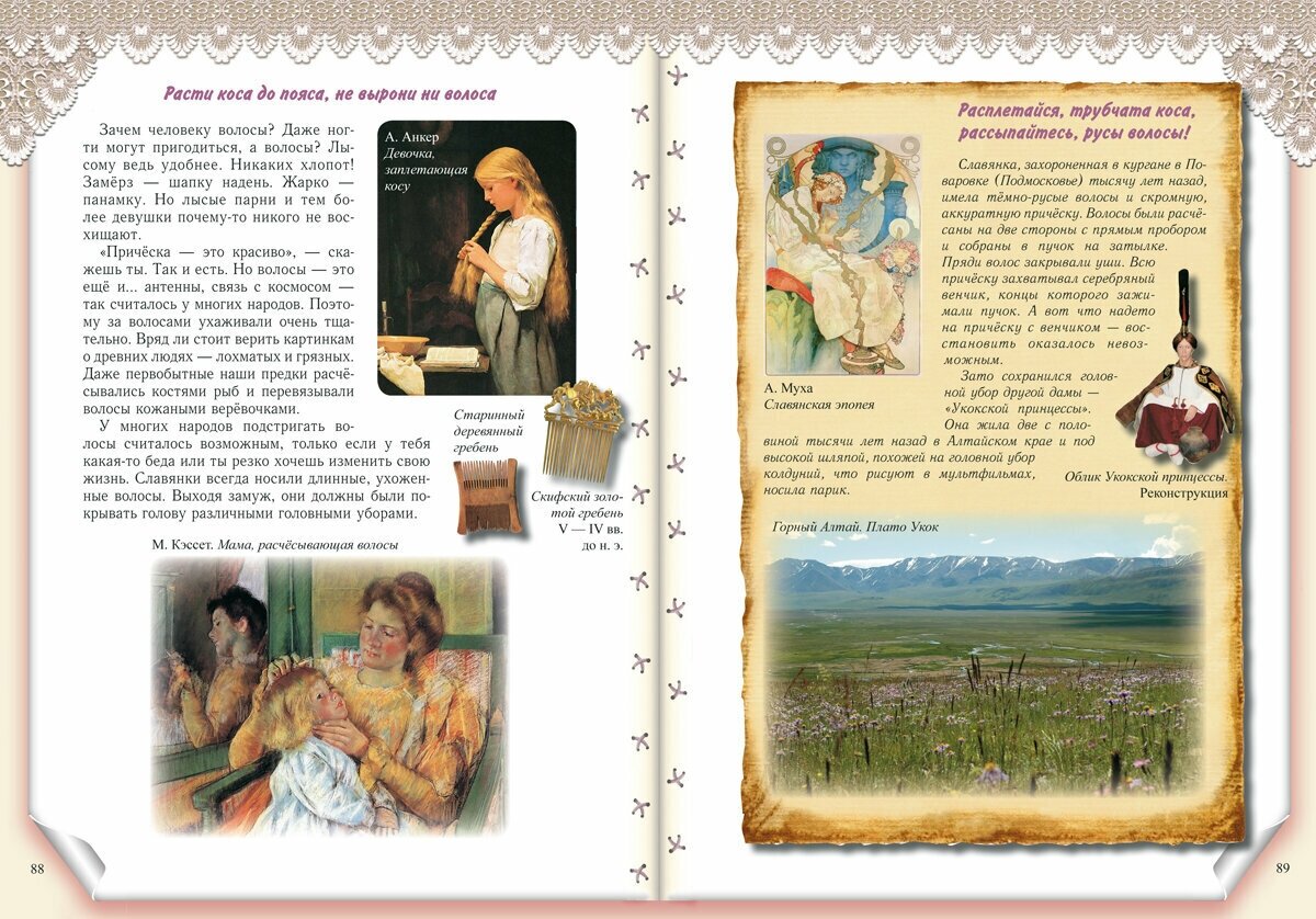 иллюстрации на каждой странице – картины, принадлежащие кисти великих мастеров живописи: Д. Веласкеса, О. Ренуара, Э. Дега, Г. Россетти, И. Прянишникова, К. Маковского, Б. Кустодиева, А. Рябушкина, Н. Богданова-Бельского, С. Жуковского, А. Корзухина и многих-многих других.