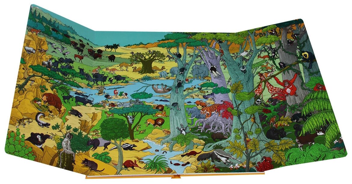 Эта удивительная книжка-раскладушка - захватывающий путеводитель по миру животных, который познакомит вас с различными животными, птицами, рыбами, рептилиями и насекомыми. Что можно делать с этой книгой: тренировать внимание, находя на большой картинке множество мелких деталей, развивать память, тренировать счет, расширять словарный запас, придумывать истории. 5 раскладывающихся панорам: птицы, рыбы, млекопитающие, рептилии, насекомые.