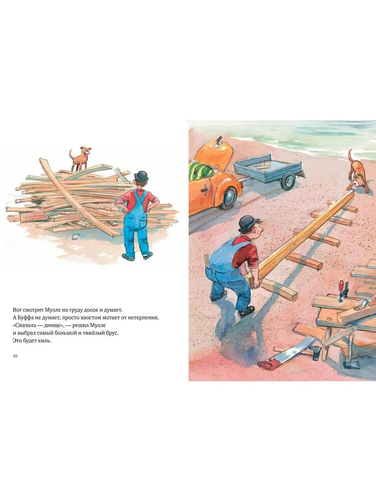 Когда закончится дорога, начнётся море, и на этот раз Мулле нужно построить лодку. Когда закончится море, начнётся что-нибудь ещё. Собака Буффа как бы спрашивает хозяина о том, что будет дальше, или как и из чего делают лодки, а хозяин понимает её без слов и вслух отвечает. Так читатель узнаёт что да как. Рассказ больше напоминает энциклопедическую справку, нет художественной выразительности. Мне было скучно читать. Не знаю, как детям Скандинавии, может, они все там лодки с детства учатся делать, но нашим бы детям интересную книжку с окошками, сюрпризами о технике или магнитами, чтоб самим руками поделать. А что из этой-то истории запомнится, пара терминов? Всё равно в словаре надо смотреть. Мне не понравилась серия про Мулле - скучно. С таким же успехом можно девочкам про выпечку рассказывать. Хотя у Свена Нурдквиста хорошая история получилась про именинный пирог, но там и фантазии больше.