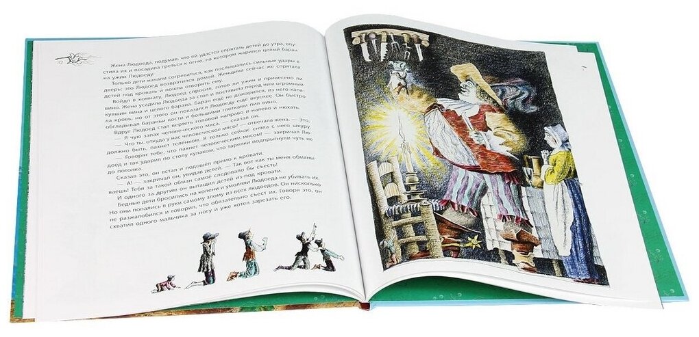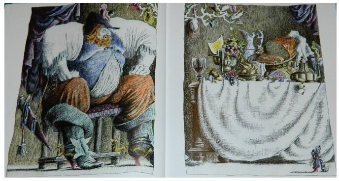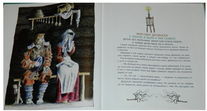 Эта книга содержит 2 сказки: "Кот в сапогах" в пересказе Т.Габбе и "Мальчик с пальчик" в пересказе М.Булатова. Страниц мало, книга тонкая, но очень большая. В руках не помещается и читать неудобно, устают руки. Иллюстрации, конечно, потрясающие, прямо завораживают. Вроде, и котов в сапогах немало уже было издано, а всё равно руки тянутся)) Хотя именно эти рисунки несколько мрачноваты. На мой взгляд, такая более реалистичная интерпретация сказки в художественном плане больше для младших школьников подходит.