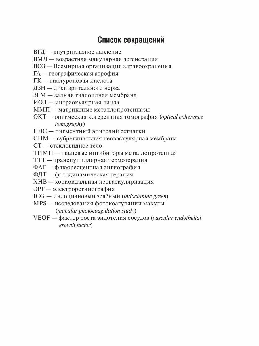 Руководство знакомит читателя с новыми взглядами на закономерности и механизмы развития возрастной макулярной дегенерации. Описаны ее этапная клиническая картина и методы диагностики. В отдельной главе представлен экскурс в анатомию макулы и стекловидного тела. С современных позиций рассмотрены факторы риска и патогенез заболевания. В книге приведён анализ возможных способов лечения макулярной дегенерации, в том числе с помощью ингибиторов ангиогенеза. Предложены принципы лечения заболевания в зависимости от его стадии. Материал иллюстрирован таблицами и рисунками. Предназначено для практикующих врачей-офтальмологов, специалистов, повышающих квалификацию, а также будет полезно студентам медицинских вузов.